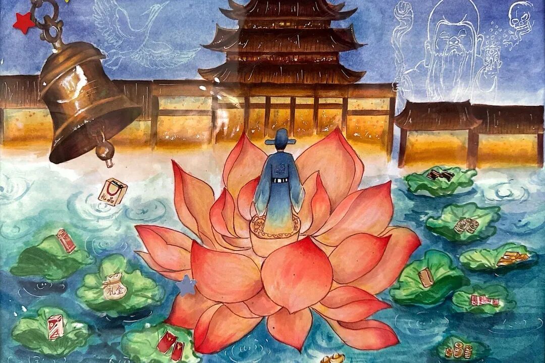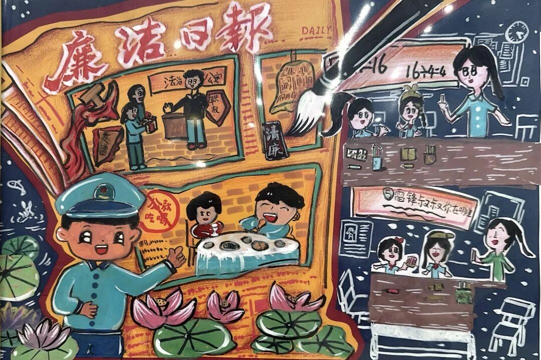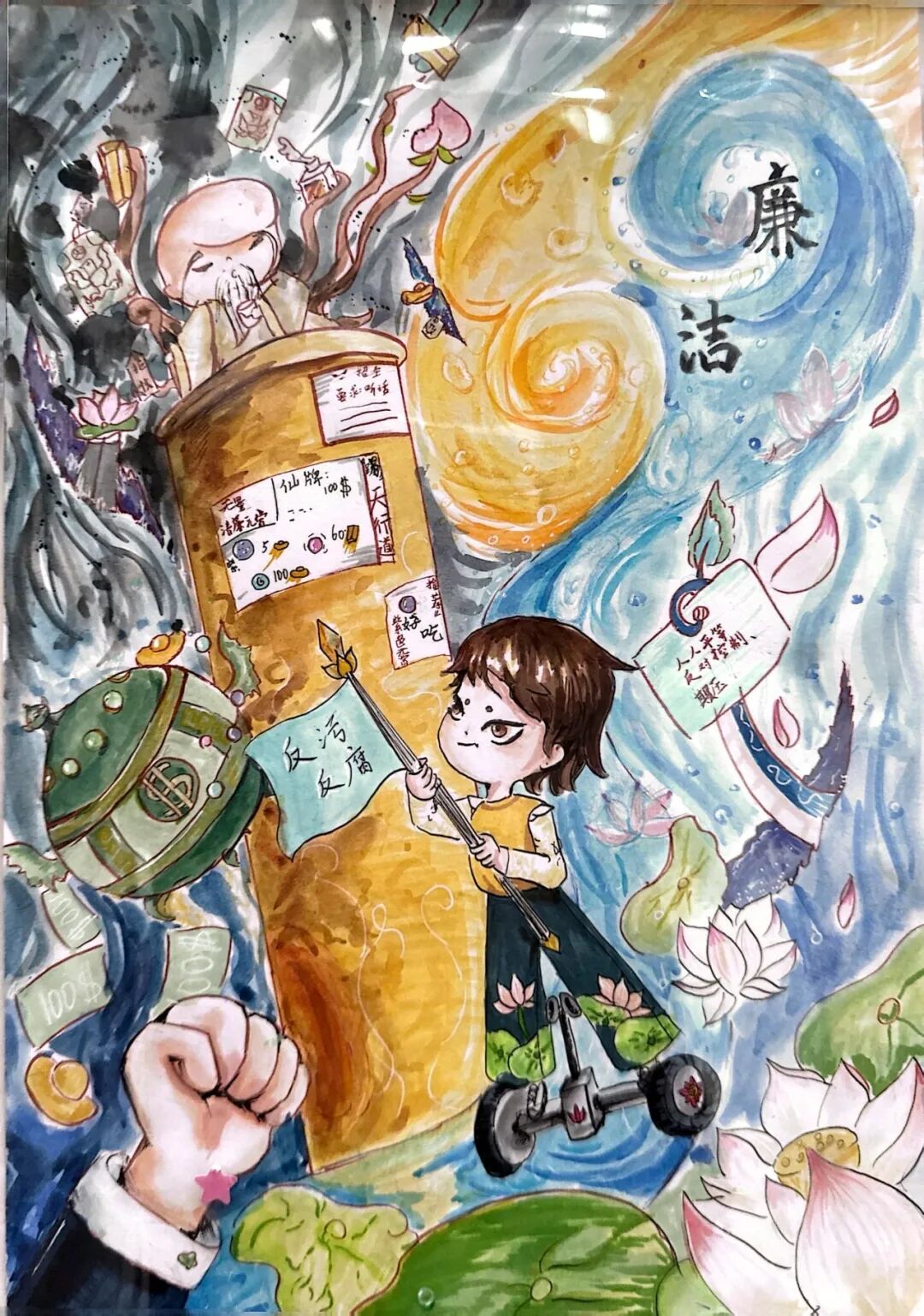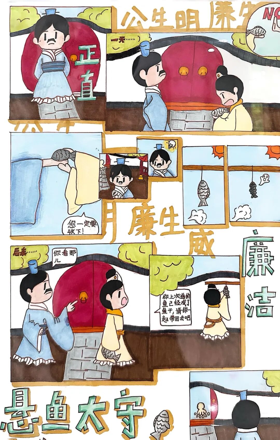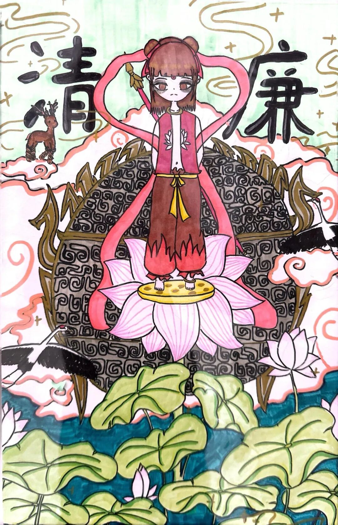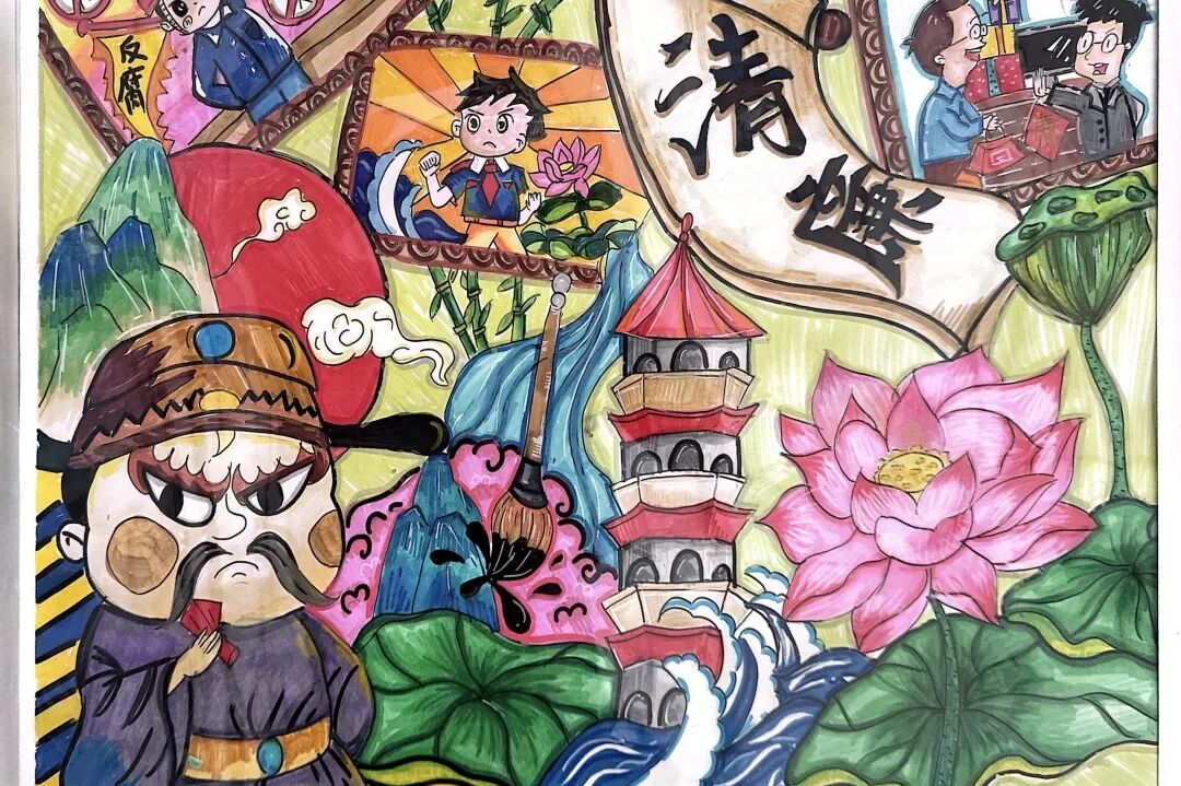 这些孩子的作品来自杭州市各中小学,杭州青少年活动中心卡通项目组完成征集、整理、初评、推荐、宣发等工作。同学们从“两袖清风”的于谦、“悬鱼拒贿”的羊续、“一尘不染”的孔繁森等清廉典范故事中找灵感,再融入《钱氏家训》等传统文化元素,以鲜明的艺术形象展现“正心明道、修身齐家”的清廉之风。