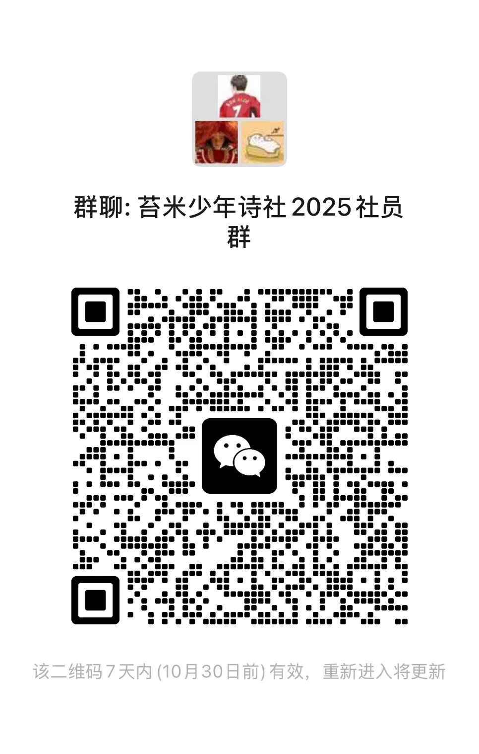 请以上(一至三年级)一二三等奖名单中的所有孩子家长扫码加入杭州苔米少年诗社(面向一至三年级)2025新社员微信群。