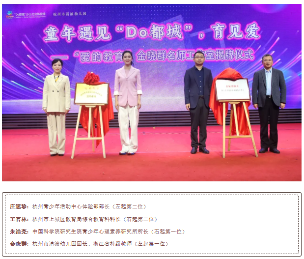 11月7日,童年遇见“Do都城”,育见爱——“爱的教育”金晓群名师工作室揭牌仪式在杭州市青少年发展中心举行。本次活动以名师工作室为核心纽带,创新搭建馆园教育合作新桥梁,推动百年“爱的教育”为体验教育高质量发展注入强劲动能。