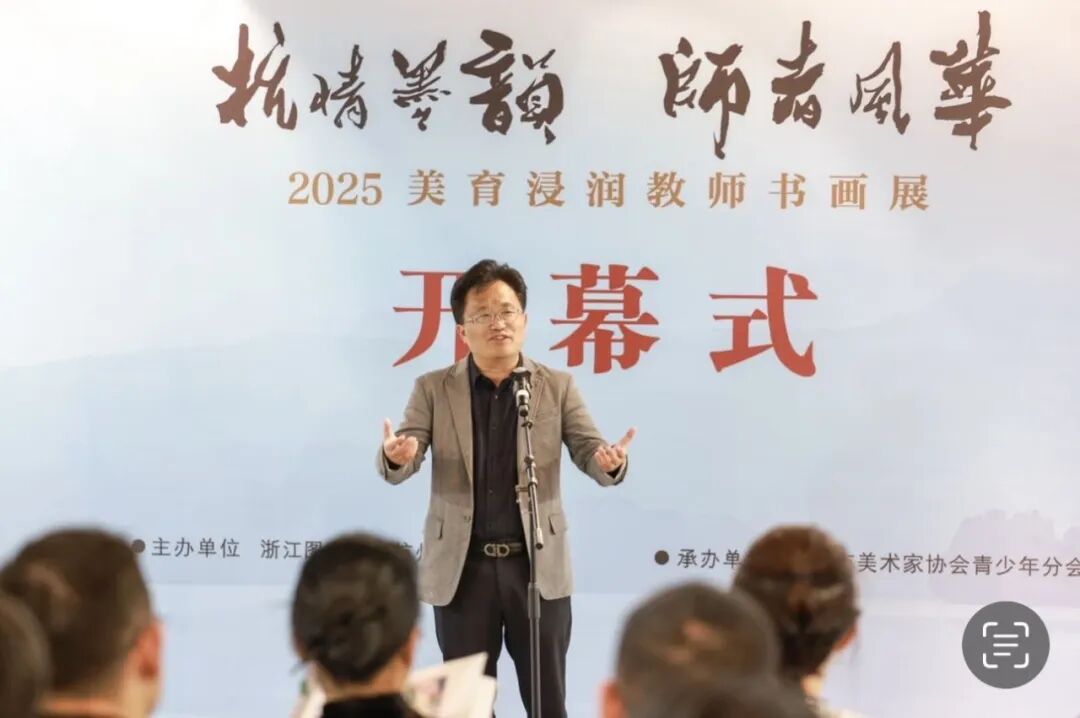 11月15日下午,由浙江图书馆、杭州市美术家协会联合主办,杭州市美术家协会青少年分会承办的“‘杭’情墨韵 师者风华——2025美育浸润教师书画展”,在浙江图书馆(曙光路馆)一楼展厅举行开幕式。杭州市文学艺术界联合会秘书长程育青,杭州市基础教育研究室美术教研员、中国美术家协会会员李方,杭州市美术家协会副主席兼青少年分会主席高甬春,以及分会副主席,分会创作辅导委员会副主任,秘书长等领导和嘉宾出席开幕式,与近百位参展教师、艺术爱好者共赴这场初冬的艺术之约。