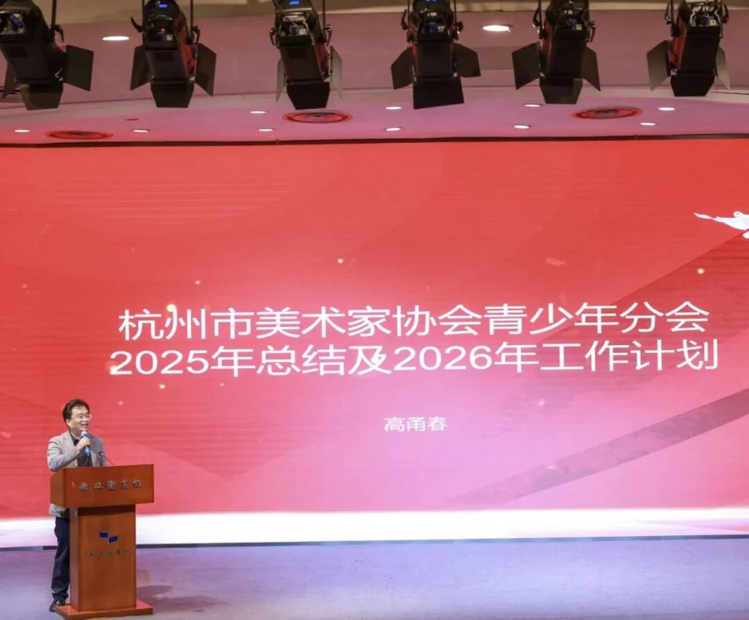 开幕式后,“杭州市青少年美育浸润艺术之约”主题活动在浙江图书馆二楼报告厅举行。活动由分会秘书长徐帆主持,分会创作辅导委员会副主任黄华高、第十二届“发现杭州小画家”承办方应佳辰及“留白不设限”策展人张晨昕分别介绍了第二届“小小雕塑家”赛事、第十二届“发现杭州小画家”赛事、美术部特色活动“留白不设限”。三位主讲人都通过此次活动分享,表达了开展的活动或是赛事,均旨在通过沉浸式、体验式的艺术实践,激发青少年的创造力,让美育真正“浸润”到每一位学子的成长中。随后,由杭州市美术家协会青少年分会副主席夏琳为新聘的八位委员颁发聘书,欢迎他们加入分会的大家庭。最后,由分会主席高甬春总结2025年分会工作以及展望2026年计划,他说:“分会在2025年青少年美育普及、艺术创作引导及各类主题赛事组织方面取得的成效,有效激发了青少年的艺术热情与创造力。展望2026年,将持续深化美育实践,凝聚分会各方力量,拓展多元艺术交流平台,分会将更多维度地助力青少年的美育成长。”