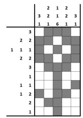 2.每一组数字对应的像素格之间有间隔(间隔至少 1 格,但不一定是 1格)。例如第 2 列的数字为(2,2,1),则表示涂的方格数从上至下依次为2 格,2 格和 1 格,且两两相邻的方格堆中至少有一个空方格。