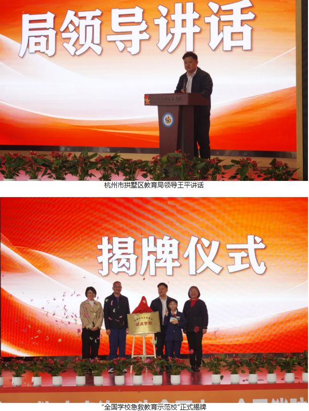 活动开幕仪式上,杭州市拱墅区教育局领导王平讲话。王平表示:“安全是成长的基石,希望每位同学都能把应急技能学深学透,把安全意识刻在心里!”杭州长寿桥教育集团的校园红十字会成员身着统一制服登场,标准的心肺复苏按压、规范的包扎操作,引来同学们阵阵惊呼。现场,杭州市红十字会党组成员、副会长梁强勇、杭州市应急管理局应急宣教和保障中心主任翁如彬为“全国学校急救教育示范校”揭牌。