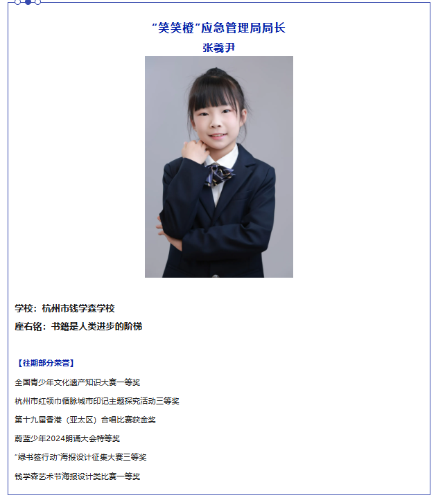 钱江潮涌,奔腾时代,生活在古典人文与现代科技交相辉映的杭州,从钱王射潮的典故里到如今互联网之都的多龙并进,可以感受到这座城市的独特气质中富有一股“弄潮”精神,这不光影响着这一方水土的奋斗者,更深深地浸染着一位小小少年。她就是新一届“笑笑橙”应急管理局局长张羲尹。学习做舟,知识为桨,以行动指引方向,一路向前。今天让我们一起感受张羲尹身上焕发的活力与能量。