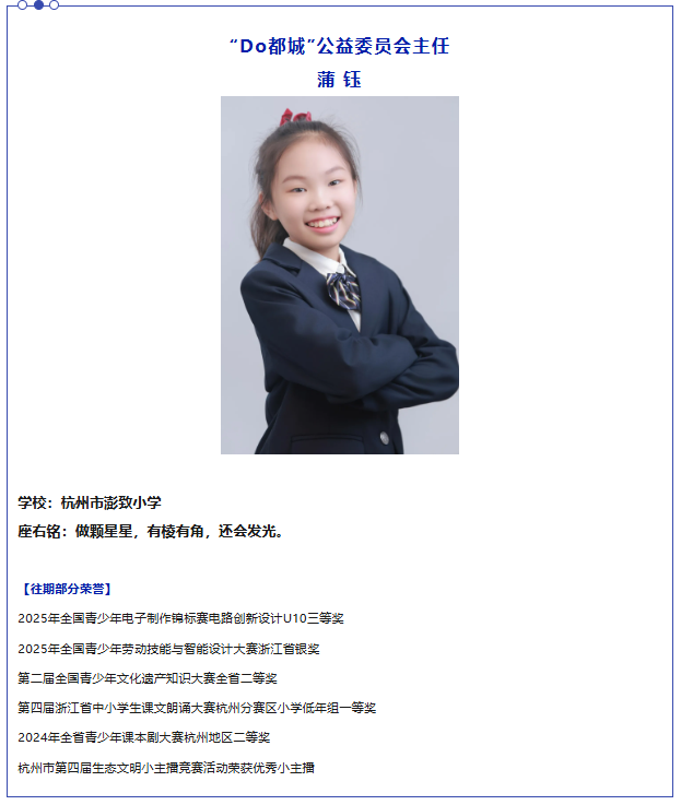 作为杭州市城市规划展览馆的特约讲解员,她以饱满热情向游客讲述杭州的城市故事与规划蓝图;身为“笑笑橙”消防安全红领巾宣传大使和儿童友好小小安全宣传员,她化身“安全小卫士”,通过趣味讲解和情景剧表演传播消防与安全知识;担任杭州市红领巾小记者时,她用文字记录身边的美好与感动;在澎致小学第六届大队委组织委员、杭州市红领巾志愿者服务队队委的岗位上,她学习沟通协调、组织活动,并发起“杭州市小澎友公益基金会”,将义卖所得用于帮助山区学生,让温暖跨越山海。