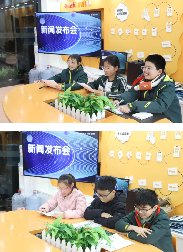 “未来新闻人”们的最后一课由自己做主,分角色,设计筹备,开展一场别开生面的模拟新闻发布会。可以是新闻发言人、可以是摄影摄像、可以是提问记者。一学期的学习与实践让孩子们从最初的羞涩紧张,到如今能够从容选题、撰写稿件、设计问题,在一次次采访与播报中,逐渐找到了自己的“新闻声音”。