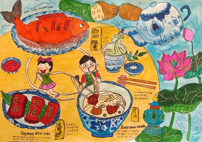 本次活动自7月底启动以来,收到了来自杭州市各个学校的精美作品,更有来自外省的孩子参与其中。作品中,“舌尖上的宋韵”主题占比高达43%,可见孩子们也抵挡不住美食的诱惑;“宋服里的宋韵”主题作品占比36%,可见孩子们对宋服的热情也很高涨。在作品中,孩子们都为自己的绘画配上了优美的文字,凸显主题,让宋韵意境跃然纸上。