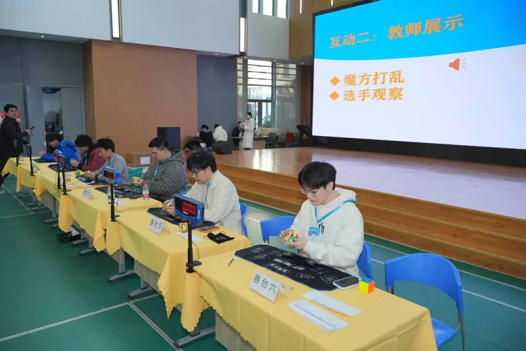 小选手们在等待决赛名单公布之余,6位魔方教师登台展示。魔方被统一打乱后,老师们同步开始复原,精湛的技艺引来台下小选手们阵阵欢呼,孩子们纷纷为老师打call!