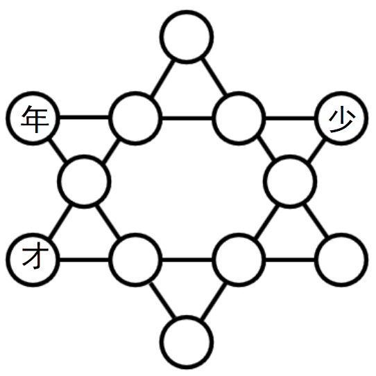 要求在圆圈内填入汉字“才智少年”,且每条直线上四个圆圈内的汉字不重复。