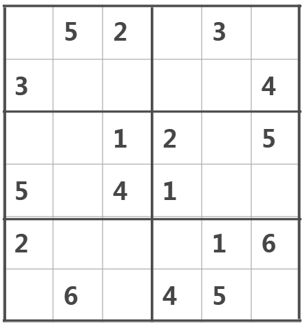 要求满足每行、每列、每一宫(加粗的线为一宫)的数字都为“1~6”,不得出现重复和遗漏。