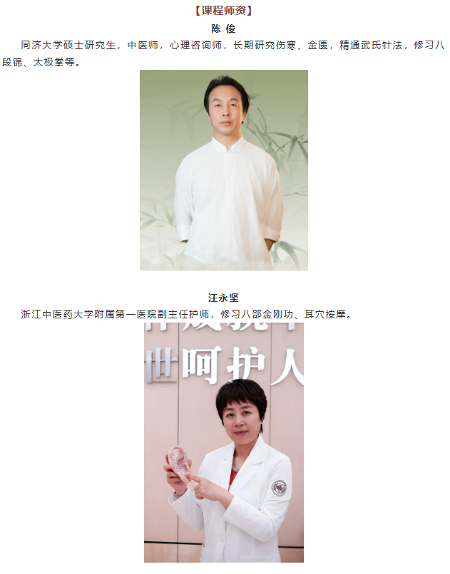 同济大学硕士及中医师陈俊、浙江中医药大学附属第一医院副主任护师汪永坚亲授,深挖《黄帝内经》《伤寒论》养生智慧,八段锦、南少林易筋经、八部金刚功、耳穴按摩等古法导引术现场示范教学,呼吸调节、动作细节逐点拆解,肩颈僵硬、睡眠紊乱等亚健康人群即学即用。
