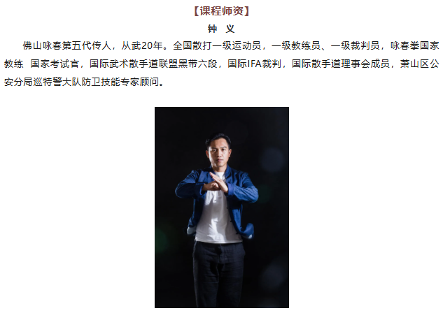 佛山咏春第五代传人钟义亲授,融合20年武学积淀,覆盖咏春基础训练与日常防身技巧,适配上班族碎片化练习,既能缓解疲劳、增强体能,又能掌握静态逃脱、物品防身等实用技能,让咏春融入职场和生活,兼顾健康与安全。