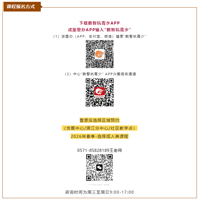 为响应青年发展型城市建设,“Do市百家” 成人学院由杭州青少年活动中心体验部依托多年体验教育积淀与资源优势精心打造。学院秉持“凝‘百家’智慧,创‘百佳’课程,理论实践同频,学习社交双赢,‘跃己’成长,‘悦己’绽放” 的核心理念,致力于构建 “低成本入场、高实用技能、轻社交压力、重体验成长” 的终身学习平台。