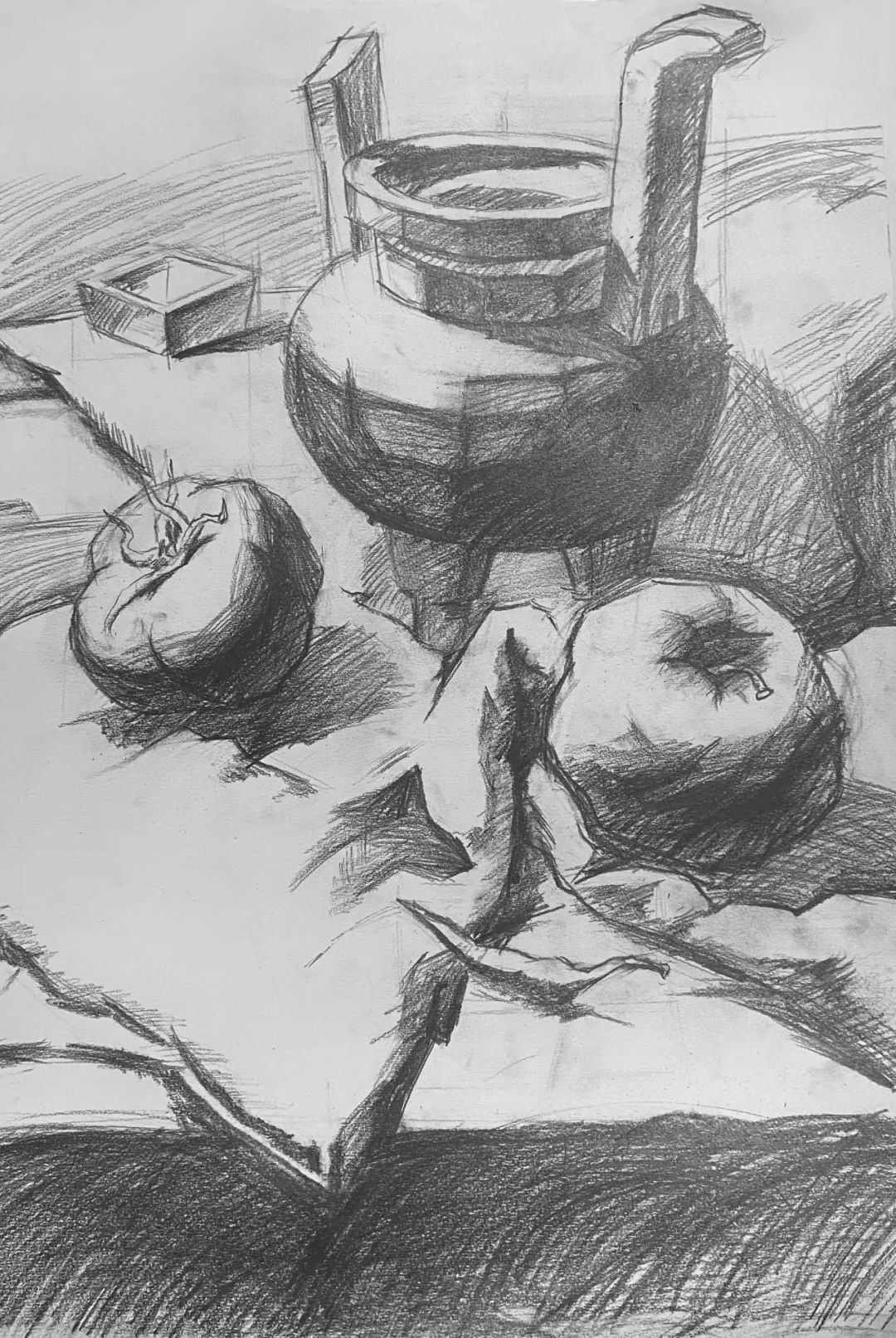 这个阶段需要多观察画面中每个物体之间的位置关系,所以刚开始起形的时候切忌看得太细,学会忽略一些小的转折,概括大致的轮廓,才能更快更准确地起形。