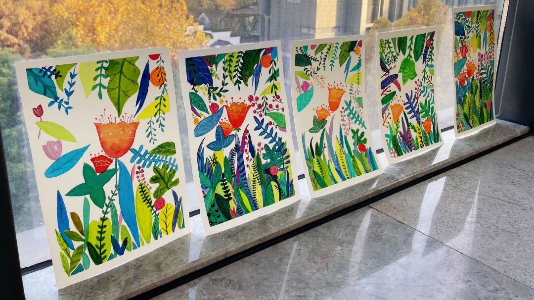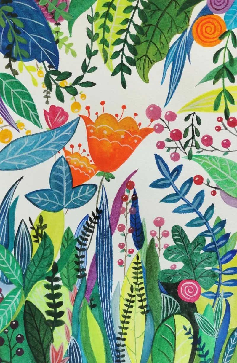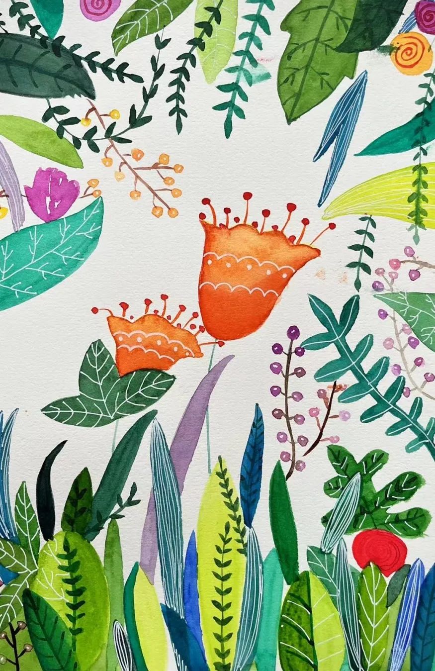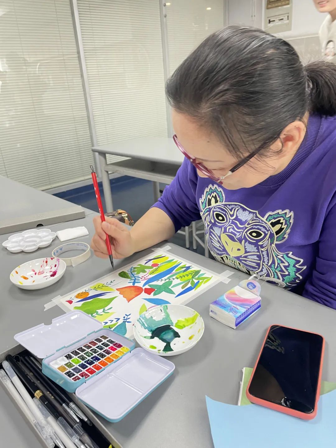 水彩绘画中的湿画法会让人酣畅淋漓,却也有诸多的不可控。而干画法的画面中,我们可以呈现更多独立的色彩。学员们不起草稿,直接开画的花卉主题,色彩灿烂无比。