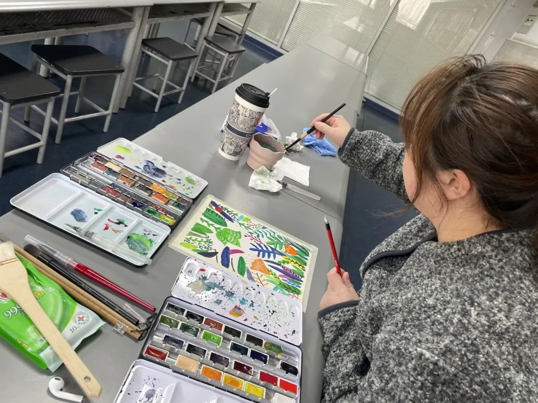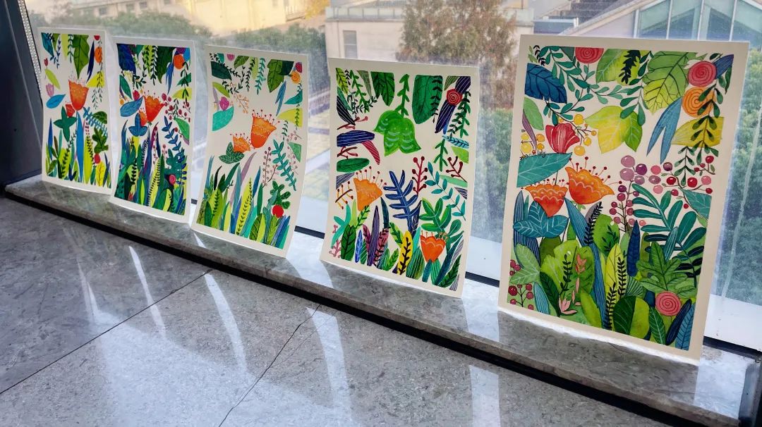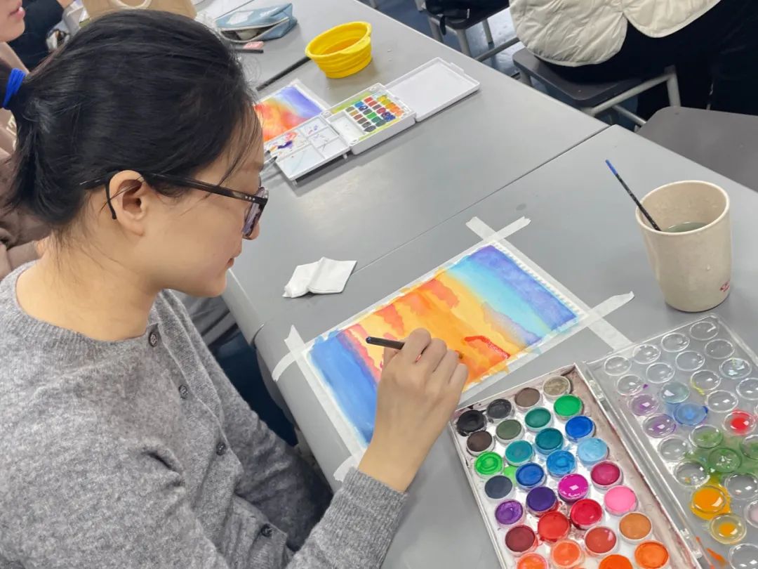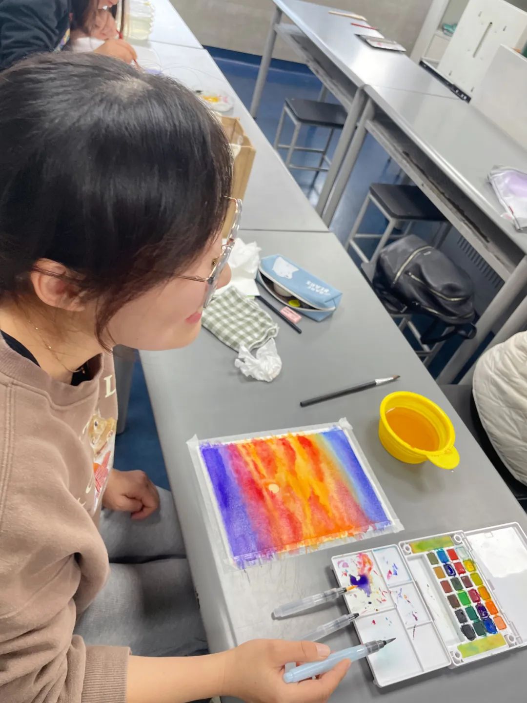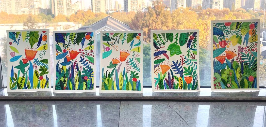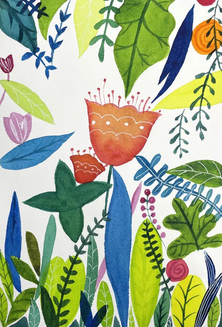 水彩绘画中的湿画法会让人酣畅淋漓,却也有诸多的不可控。而干画法的画面中,我们可以呈现更多独立的色彩。学员们不起草稿,直接开画的花卉主题,色彩灿烂无比。