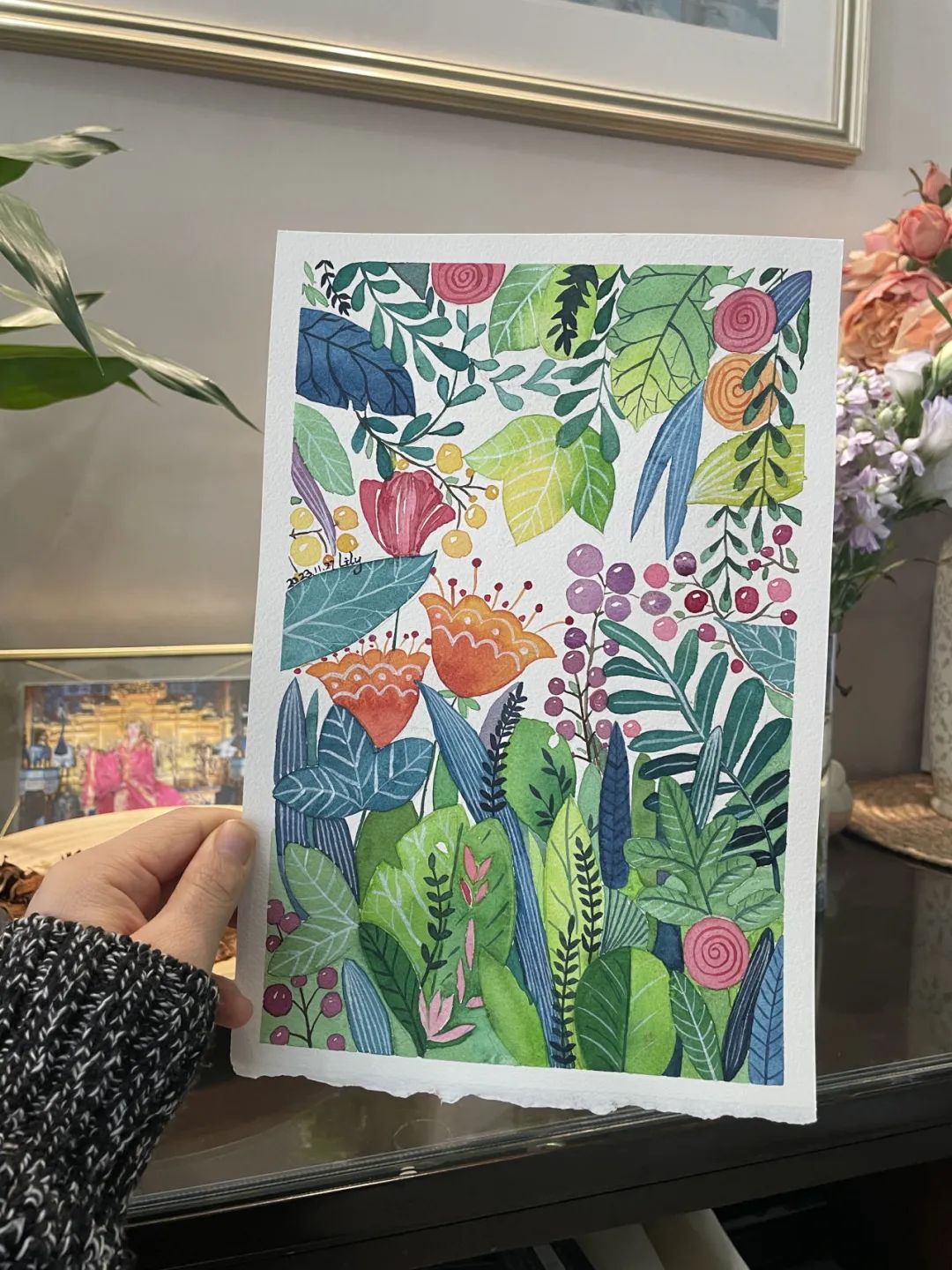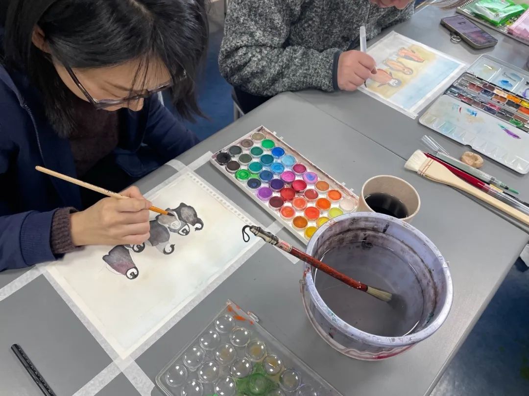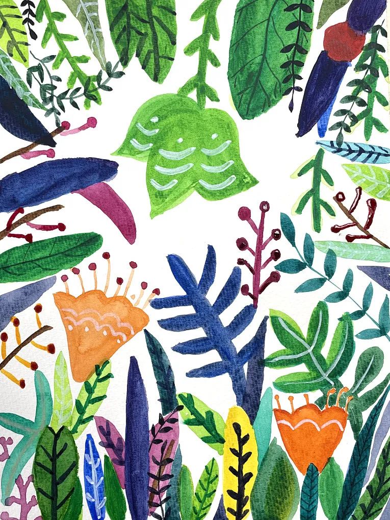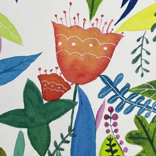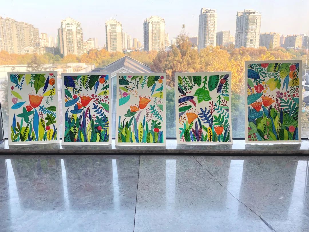 水彩绘画中的湿画法会让人酣畅淋漓,却也有诸多的不可控。而干画法的画面中,我们可以呈现更多独立的色彩。学员们不起草稿,直接开画的花卉主题,色彩灿烂无比。