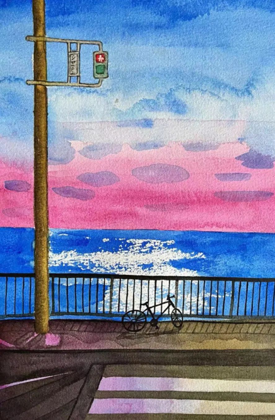 想要不间断的大片色彩,又要保留独立的色彩空间,那就可以用留白胶来帮忙。这节课主要任务:学习留白胶的用法(电线杆及路牌的留白);用飞白画法表现海面上的波光粼粼的感觉。