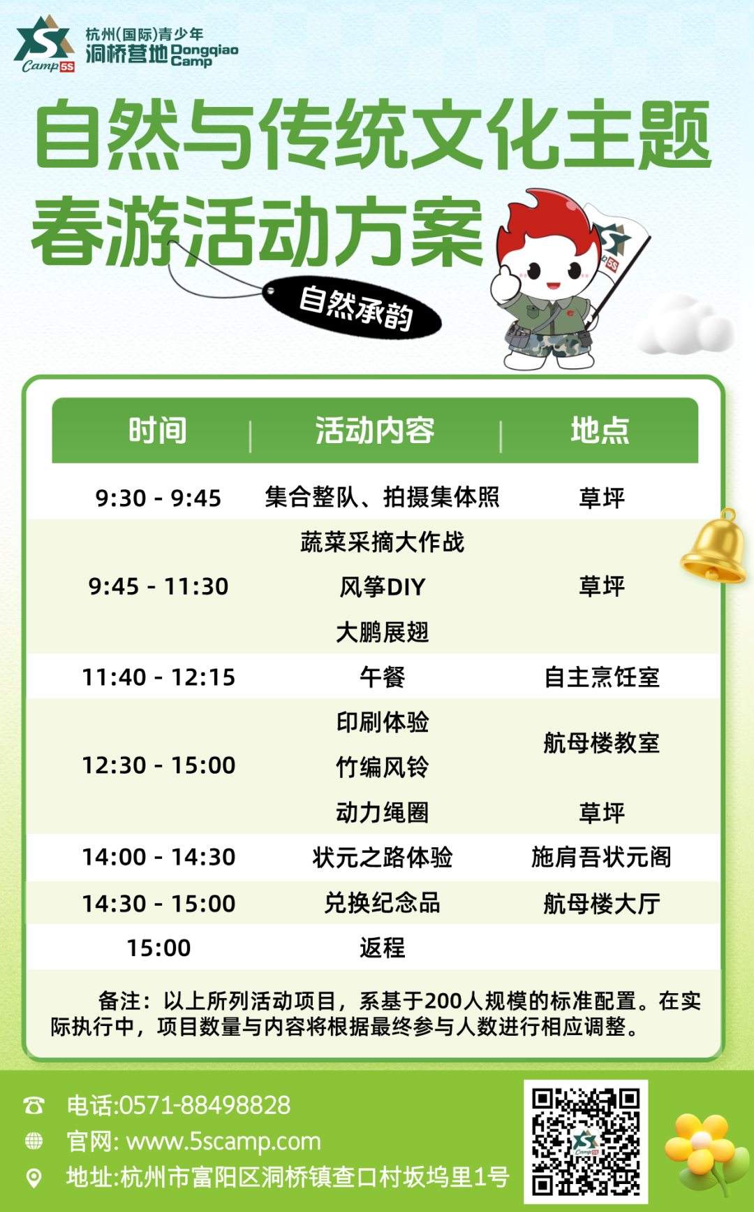 营地2026年春游活动开始预约,我们可根据不同需求定制个性化、专业化、一站式的活动,让学员们在沉浸式体验环境中突破自我、挑战自我、超越自我。赶快加入我们,让我们一起见证学员们的成长与蜕变。