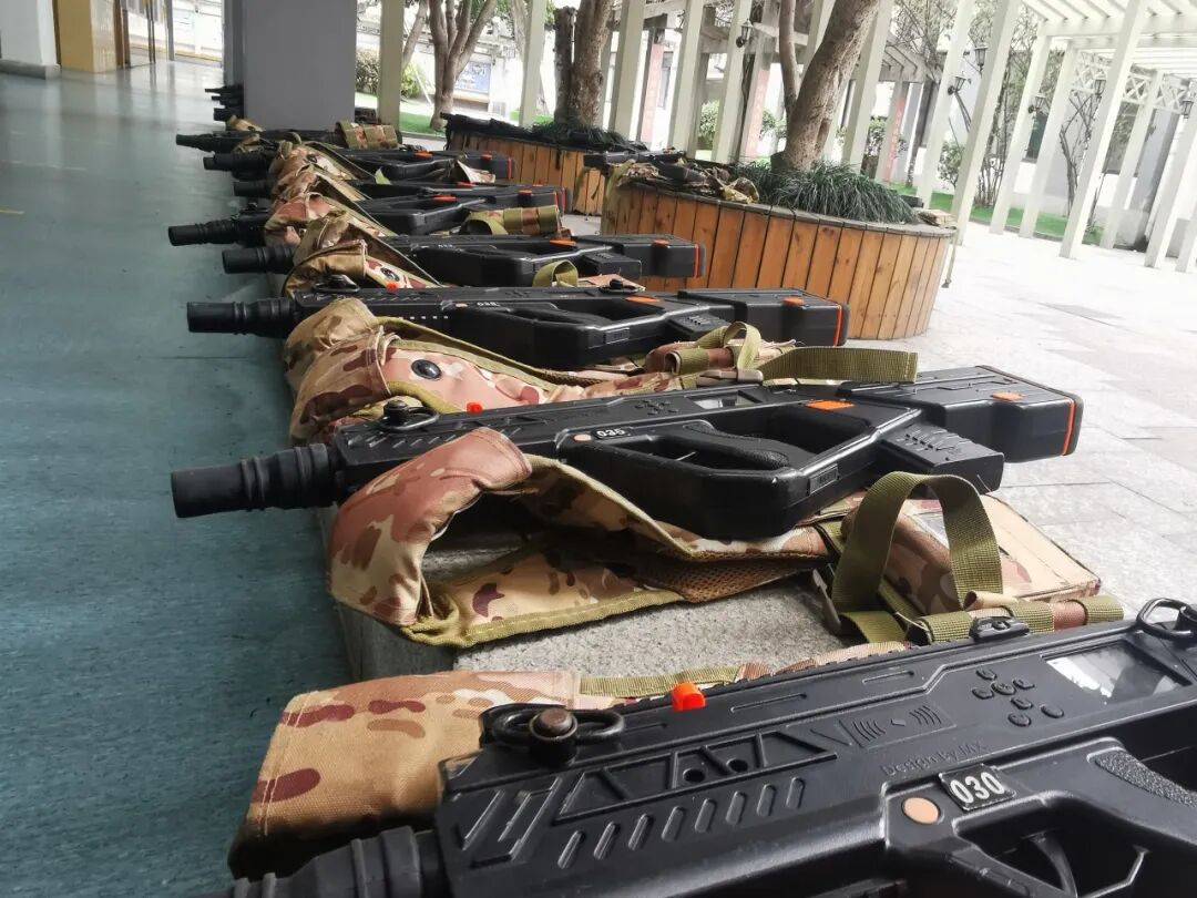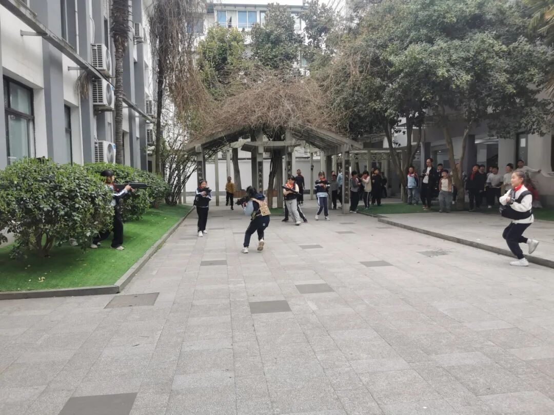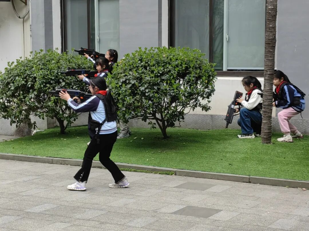 教官们将校园中的花园打造为“野战战场”,组织开展真人CS对抗赛。四年级学生在教官的专业指导下,身着装备,分红蓝两队展开激烈角逐。掩体后敏捷穿梭、战术手势默契配合、团队协同精准出击……通过实战对抗教学,帮助孩子们在体验中锻炼反应速度与战略思维,深刻理解“团结就是力量”的内涵。