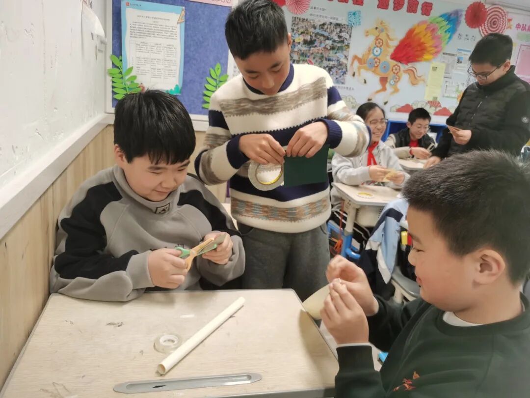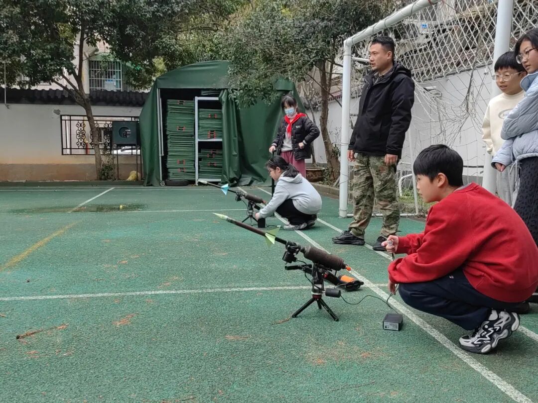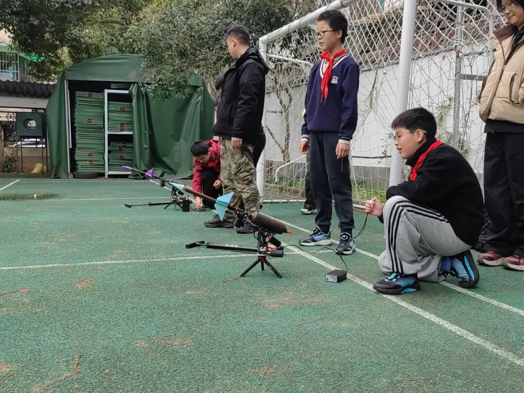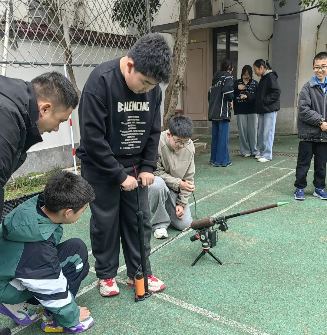 后操场上,六年级学生进行了气火箭制作与发射体验活动。在教官的专业指导下,同学们亲手制作气火箭,并在发射环节验证科学原理。从理论学习到动手实践,从制作到发射,以探究式教学激发孩子们的科学兴趣,在实践中感受科技魅力。