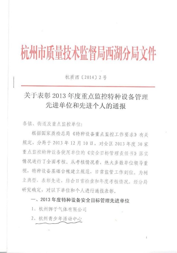 2014年1月22日接杭质西[2014]2号文件《关于表彰2013年度重点监控特种设备管理先进单位和先进个人的通报》,中心获2013年度特种设备安全目标管理先进单位。特此祝贺!