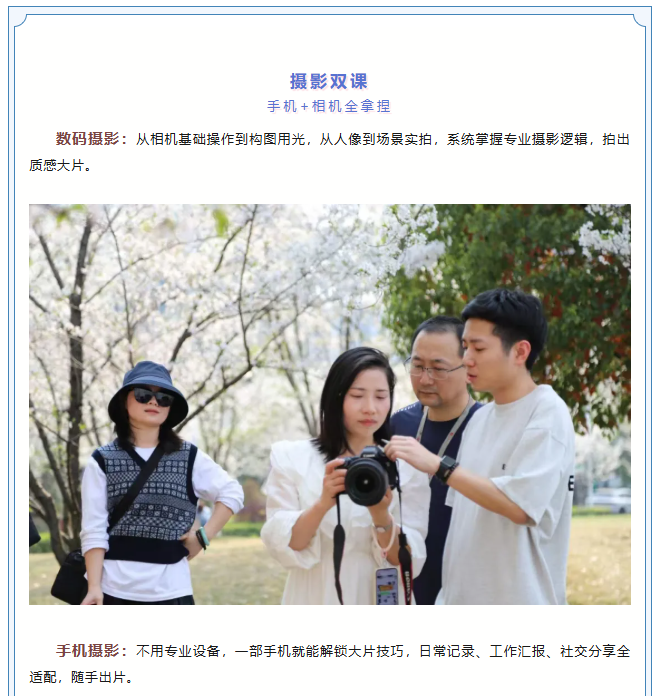 “Do市百家”成人学院联合杭州青年夜校,聚焦就业创业刚需技能,覆盖摄影、短视频、AI、财商、演讲多维度,把实用成长送到在杭青年身边,靠谱又安心!