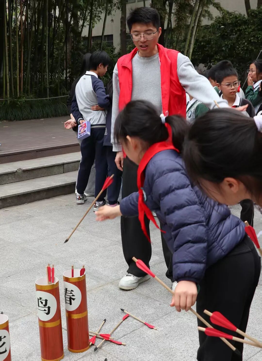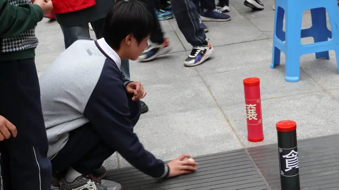 红黑两色木柱分立两端,红色柱上刻着“仁、义、礼、智、信”等十德,黑色柱上刻着“傲、贪、奢、伪、恶”五劣。同学们手持木球,俯身瞄准,轻轻滚出——球贴地而行。“是‘信’!做人要诚实守信!”击中的同学立刻大声解释其含义,赢得一片掌声。若不小心击倒黑柱,大家也会一起思考对应劣行的坏处,在笑声中完成自我提醒。这场木射体验,让德育在投掷与解说间悄然生根。