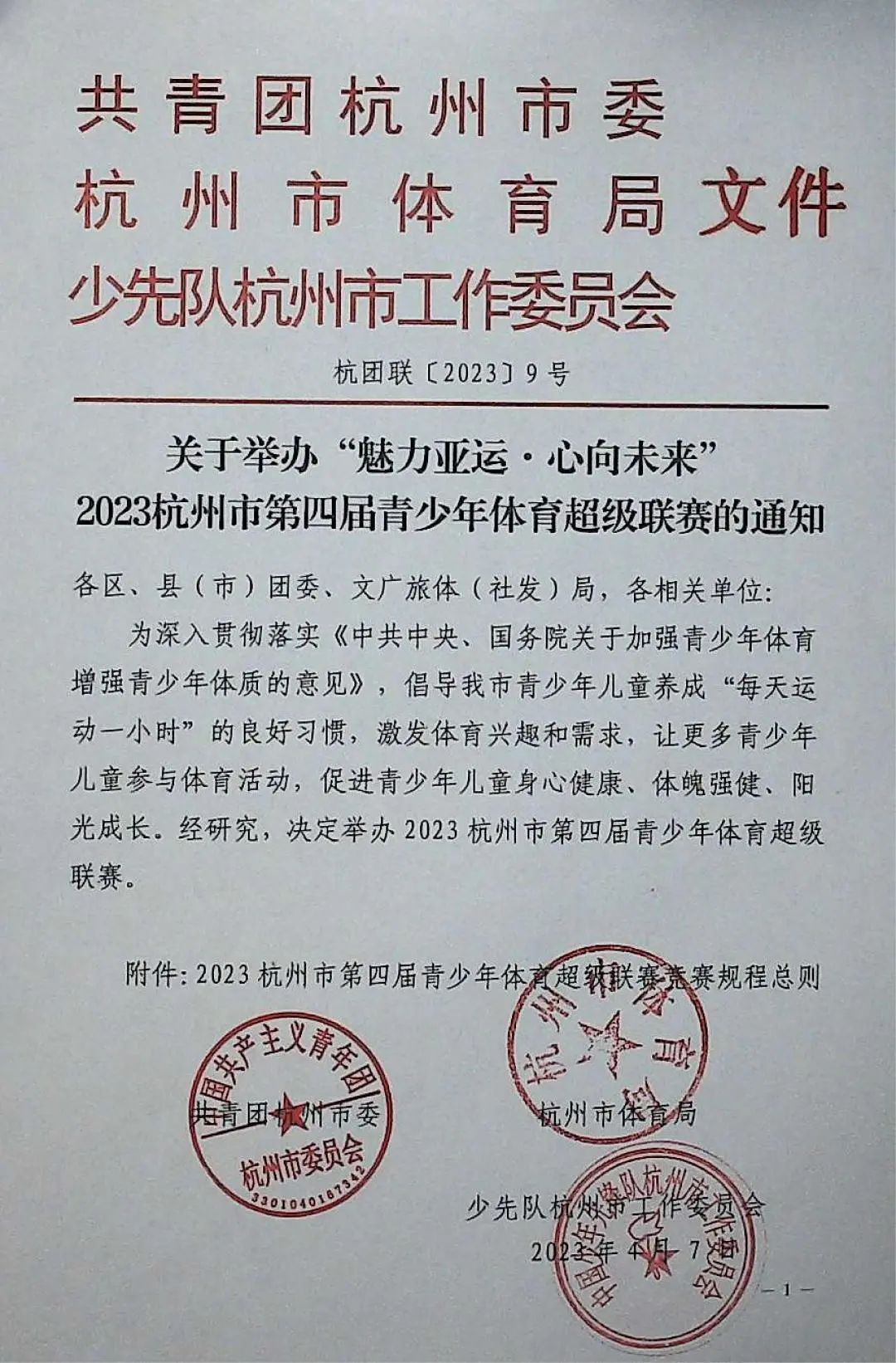 为深入贯彻落实《中共中央、国务院关于加强青少年体育增强青少年体质的意见》,广泛动员我市青少年儿童积极参与体育活动,增强参加体育锻炼的荣誉感和自觉性,养成“每天运动一小时”的良好习惯。经研究,共青团杭州市委、杭州市体育局、少先队杭州市工作委员会决定共同举办2023杭州市第四届青少年体育超级联赛。