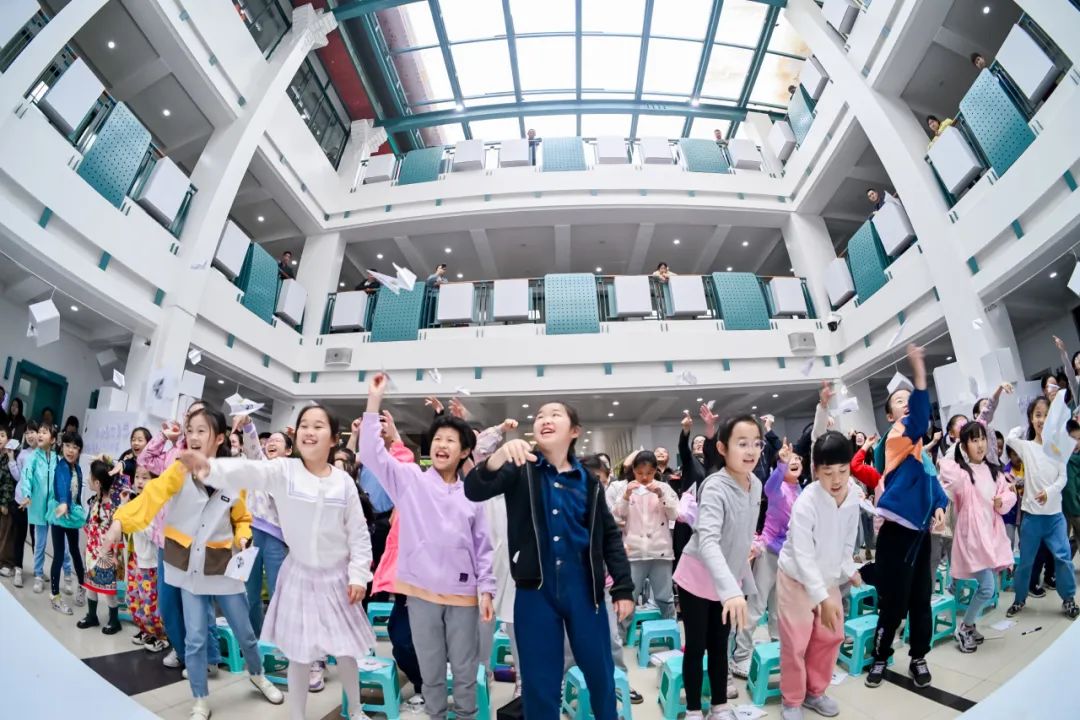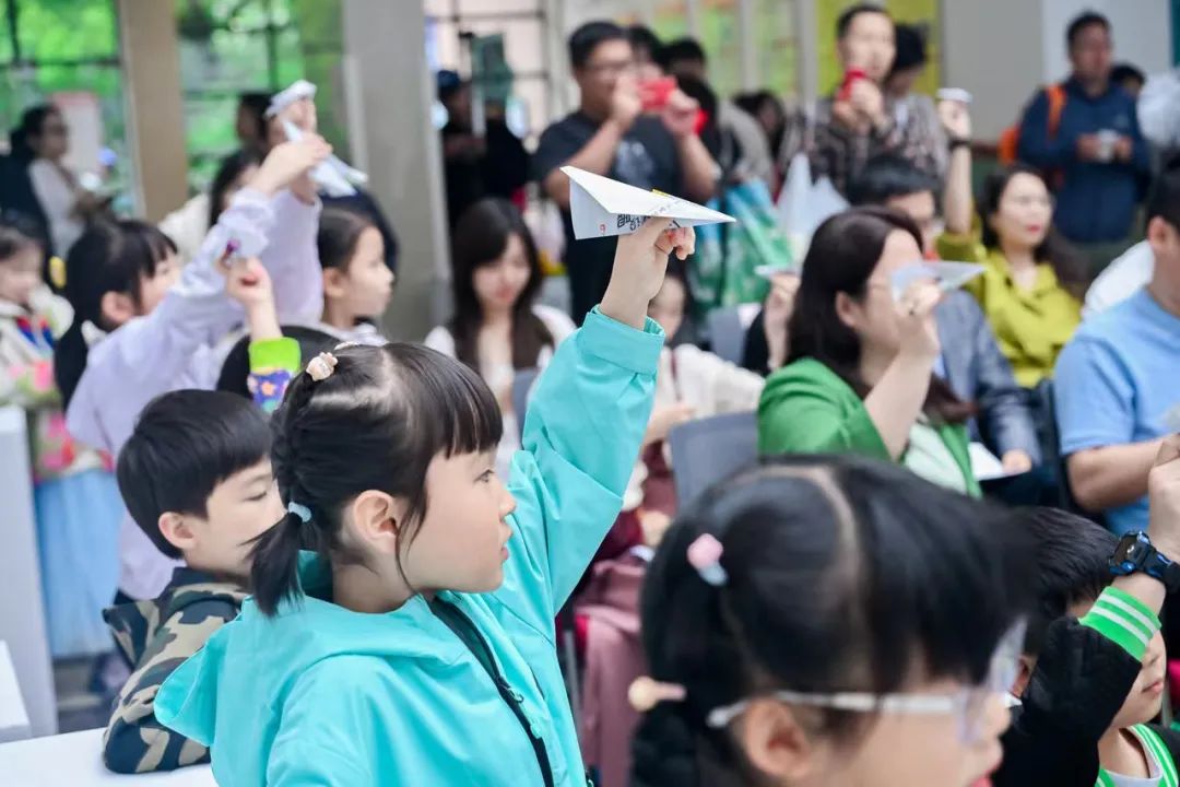 展览的现场,主持人还邀请在场的嘉宾老师、爸爸妈妈、和小朋友们一起完成展览的第一件作品《纸飞机》,把小小的方形纸折成一架可以放飞祝福的纸飞机,以共创完成一件作品的方式完成这个有意义的仪式。