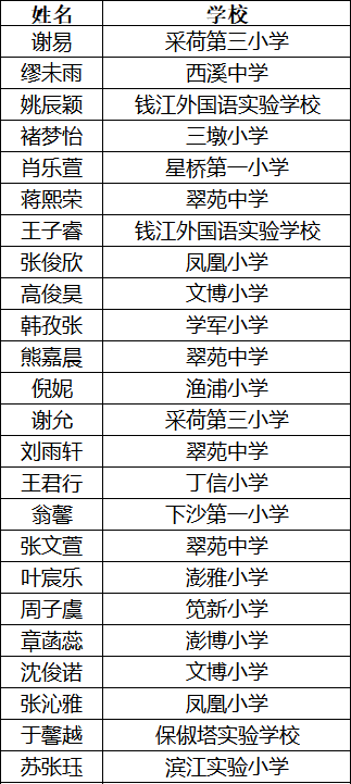 再次祝贺以上获奖小选手!本届大赛兼具专业性、趣味性和挑战性,相信活动定能进一步激发杭城青少年对杭州亚运会的关注热情,提高青少年亚运会东道主的主人翁意识,从而为家门口的亚运添彩助力。