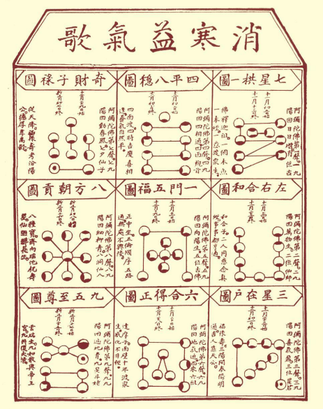 在这张图中,九个方格中各有九个圈,从冬至日起,每天用墨笔点一个圈。用不同的点来区分不同的天气:“上点为阴下点晴,左边涂雾右涂风。若逢下雪当中点,圈中加圈半阴晴。九九八一全点尽,春回大地草青青。”