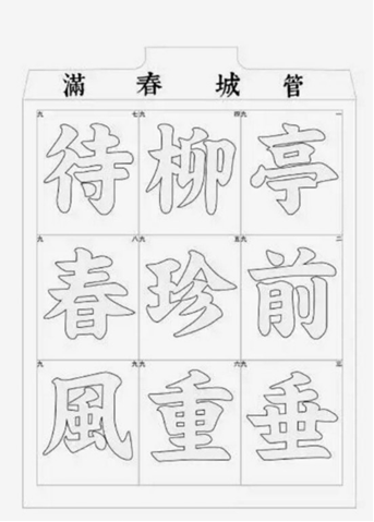 文字版九九消寒图通常是一幅双钩描红书法,上有繁体的“庭前垂柳珍重待春风”九字,每字九划,共八十一划,从冬至开始每天按照笔画顺序填充一个笔画,每过一九填充好一个字,直到九九之后春回大地,一幅九九消寒图才算大功告成。