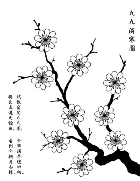 图画版的九九消寒图,又称作“雅图”,是在白纸上绘制九枝寒梅,每枝九朵,一枝对应一九,一朵对应一天,每天根据天气实况用特定的颜色填充一朵梅花。
