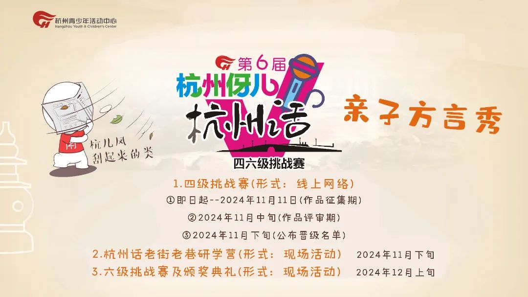 杭州青少年活动中心文学部策划组织的“亲子方言秀”第六届杭州伢儿杭州话四六级挑战赛,希望通过形式新颖独特、内容丰富多彩的杭州话系列活动,引导杭城少年儿童更深入地了解本土优秀传统文化,增强其保护和传承老底子杭州文化的历史责任感,使其树立文化自信,延续文化基因。以活动带动家庭、辐射社会,提升大众内心对于杭州话的情怀,营造保护传统地域文化的优良氛围。