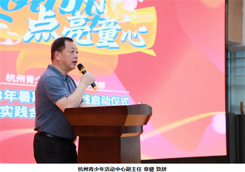 随后,杭州青少年活动中心体验部2023暑期社会实践正式启动,杭州青少年活动中心副主任章楗为实践合作学校授牌,青年学生代表郑重宣誓,继续“青春同行,创造美好教育,点亮童心,筑梦奔赴未来。”
