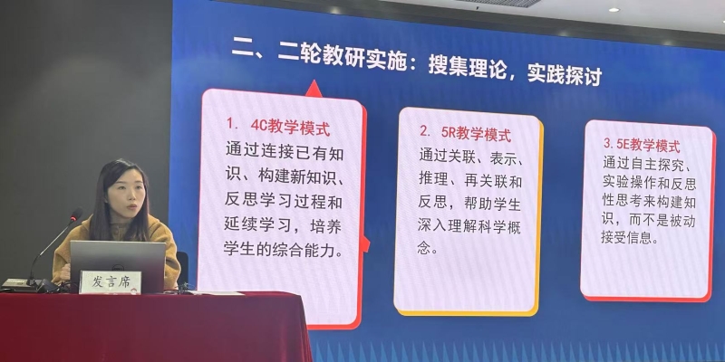 科技部分享了“科学智造教学模式”的实践探索,包括一轮教研中发现问题,二轮教研中寻求理论支持并强调可操作性,最终实现课堂实践成果的有效转化。科技部总结出通过“关联、表示、推理、再关联和反思”帮助学生深入理解科学概念的“5R教学模式”。