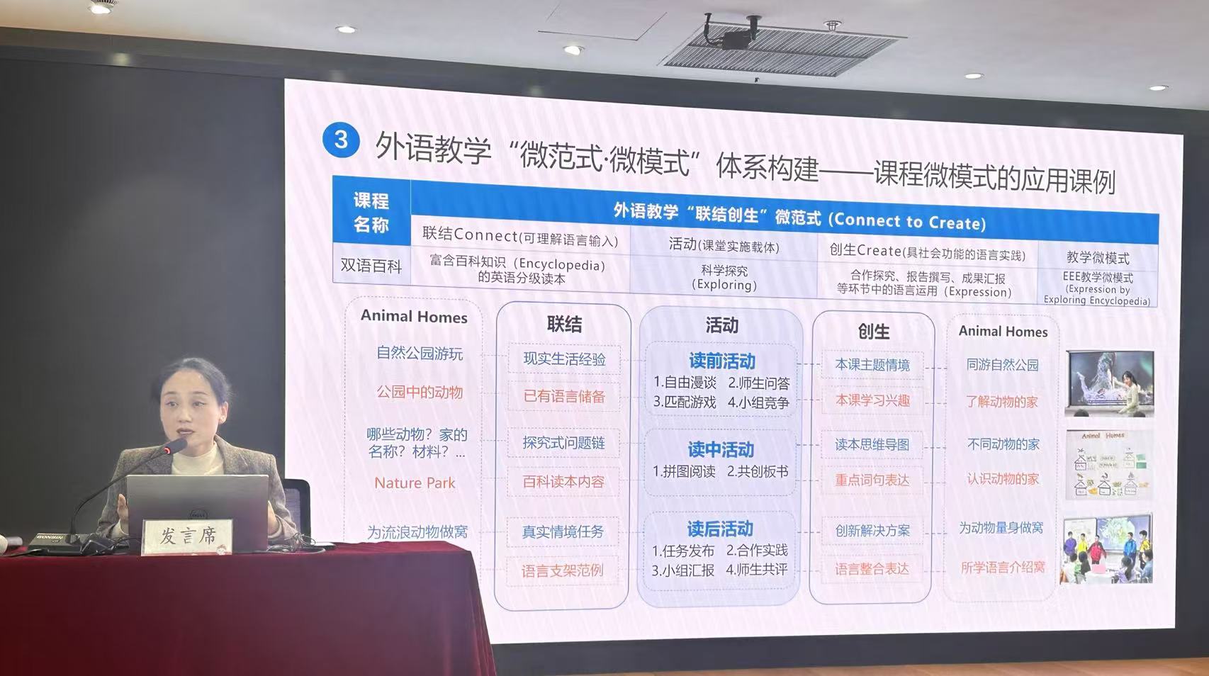 外语部介绍了部门在探索过程中的路径,对范式和模式的理解,以及构建的“联结创生”微范式体系下各课程的微模式,如英乐汇的“ARC教学微模式”、玩转绘本的“SRP教学微模式”、双语歌谣表演的“ESS教学微模式”、双语自然剧场的“PRD教学微模式”、律动之音的“PMR教学微模式”、SAM侦探团的“ECR教学微模式”、动画乐配音的“ILD教学微模式”、双语百科的“EEE教学微模式”、英语俱乐部特色班的“LAV教学微模式”、杭州少儿国际文化俱乐部的“CEP教学微模式”。这些微模式丰富了外语教学的内容和形式,提升了学生的语言应用能力。