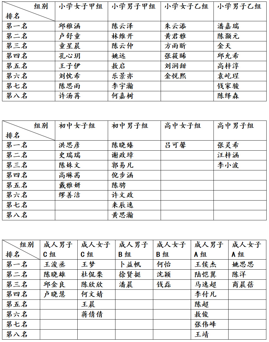 “浙青年·爱运动”杭州市第五届青少年体育超级联赛壁球公开赛成绩公示如下: