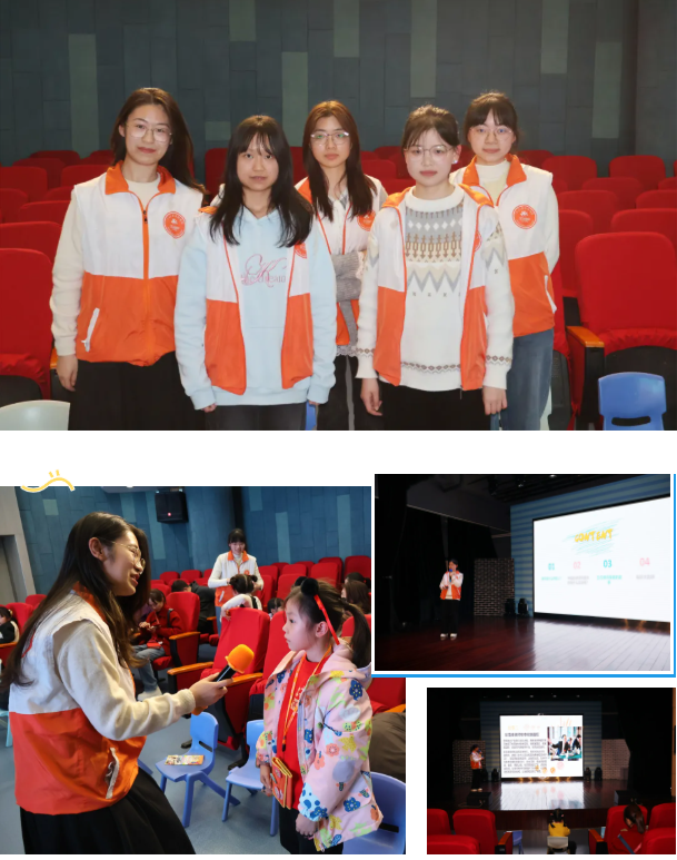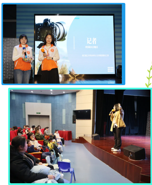 祝睿兰、叶月萍、张馨予、应宣琦、许函钰五位同学化身为梦想引路人,以“沉浸式职业剧场”为舞台,开启了一场别出心裁的职业介绍之旅。她们用生动有趣的方式引入话题,巧妙对比国内外律师与记者这两个职业的特点,并穿插分享鲜活的具体事例 ,让小朋友们听得津津有味。在讲述过程中,通过对比不同国家两个职业的境遇,在孩子们心中种下一颗颗梦想的种子。