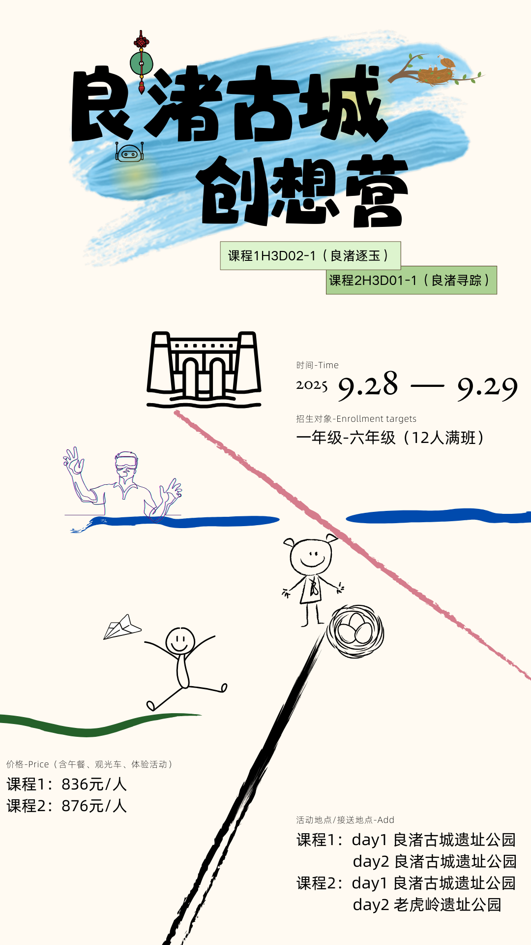 报名方式:下载数智杭青少APP,点击兴趣课程报名通道—区域预约选择活动中心—2025秋季—课程选择书画美劳类—艺启趣创绘【H3D01-1(良渚寻踪)、H3D02-1(良渚逐玉)】