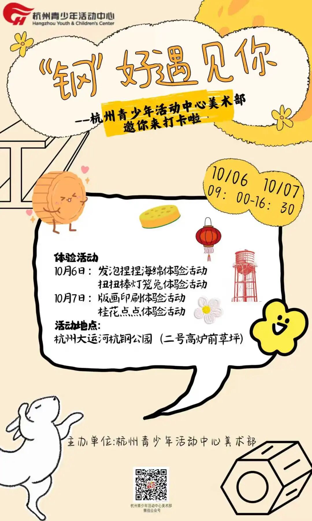 10月6日、10月7日,不管是想错峰遛娃,还是想让孩子动手又动脑,都可以来杭钢公园找我们!记得提前告诉娃,准备好开启一场好玩的国庆中秋手工之旅吧~