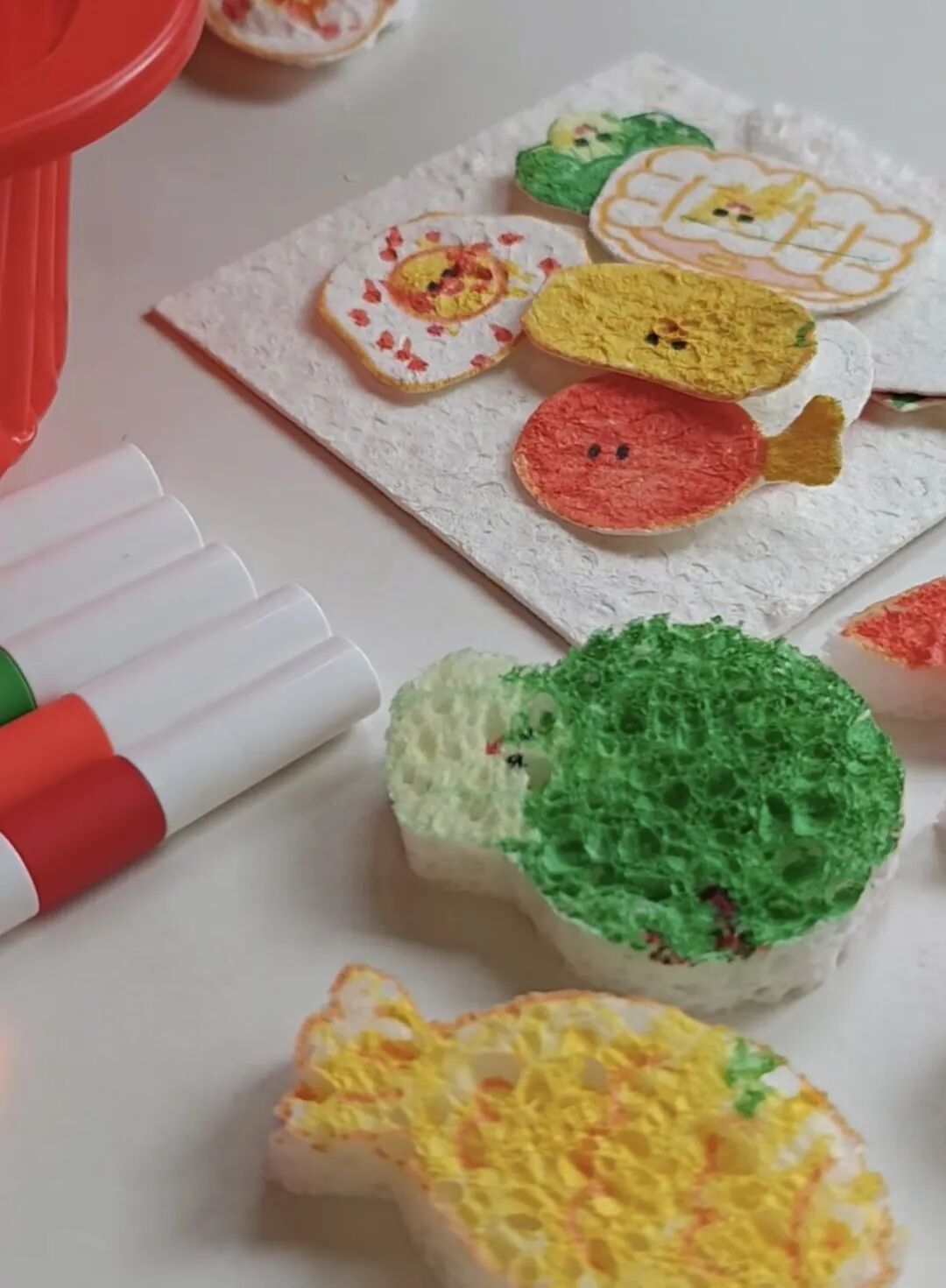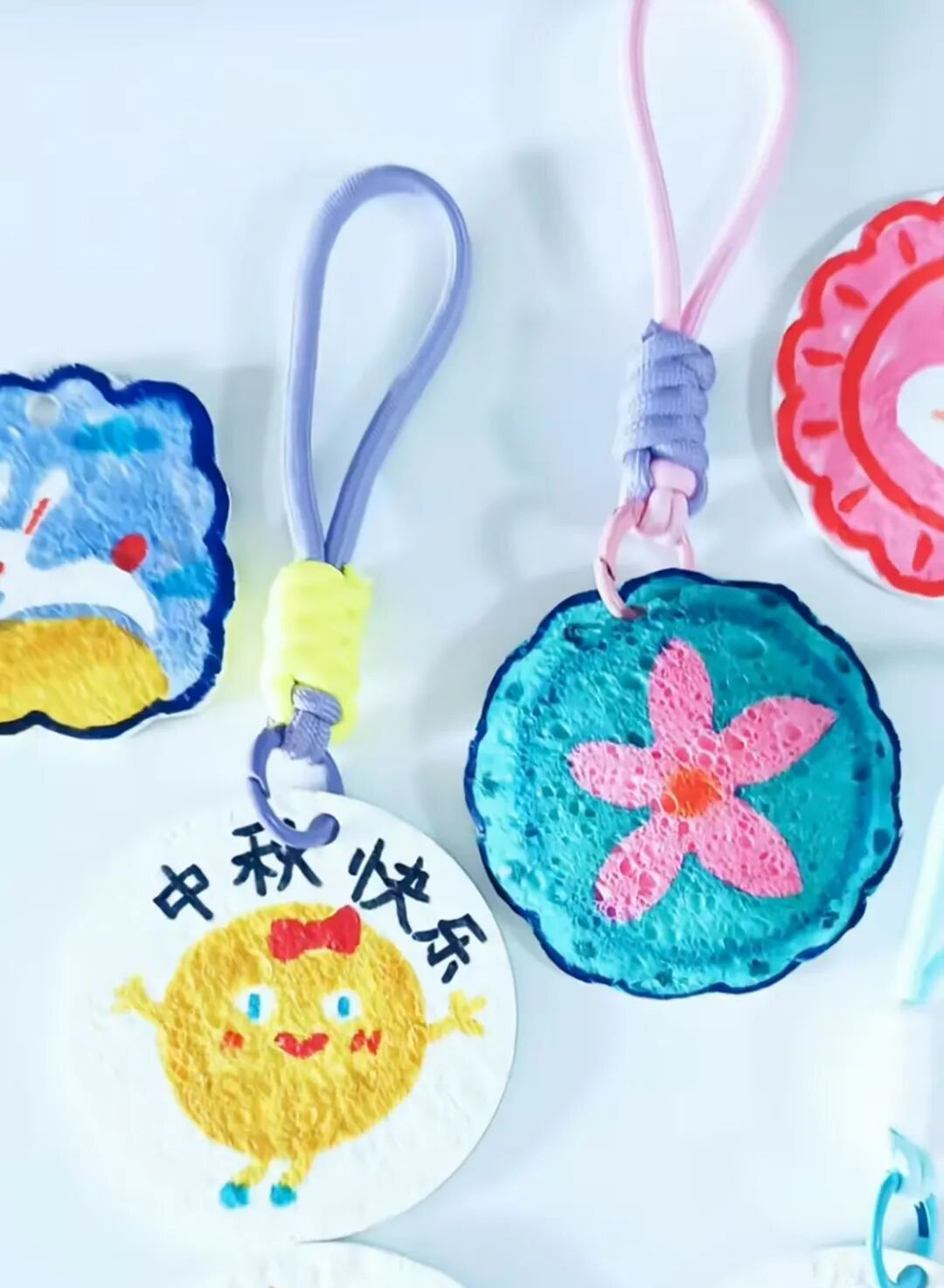 软fufu的海绵块,捏一捏、揉一揉,通过“画-滴-等-穿”步骤,结合齿轮月兔、机械月兔等元素,孩子们天马行空自由创作,就能收获一个独特的海绵挂件啦!