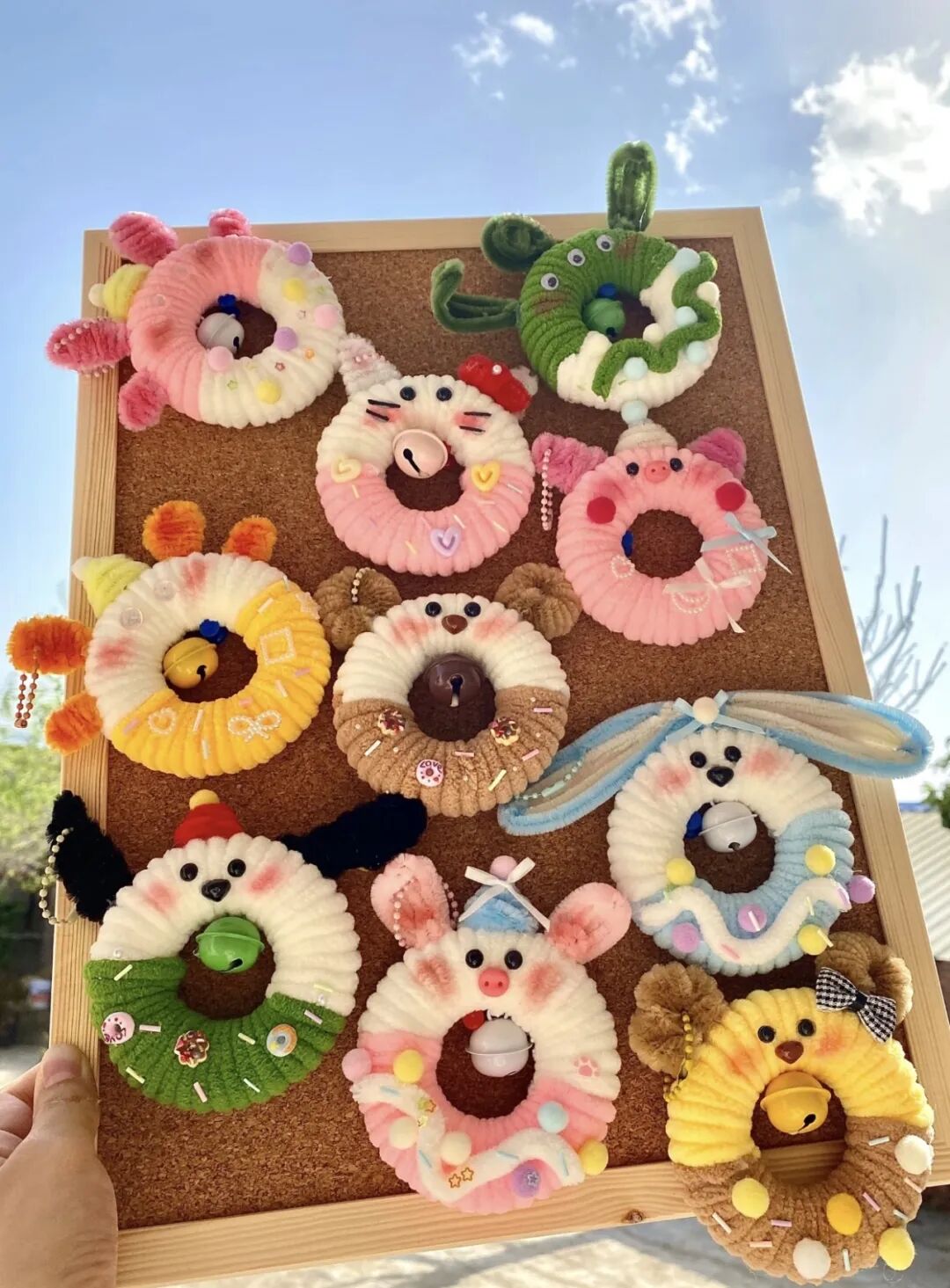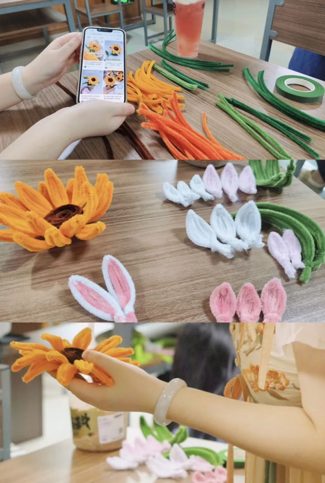 这些毛绒绒的手工是怎么制作而成的?原来是用白色的扭扭棒绕出圆滚滚的小月兔身体,再用多余的折成弯弯的兔耳朵,接着用胶水粘上亮晶晶的眼睛,一只专属小兔子就做好啦!