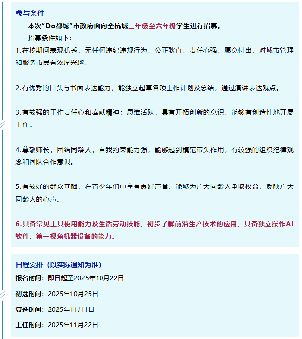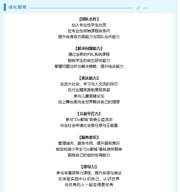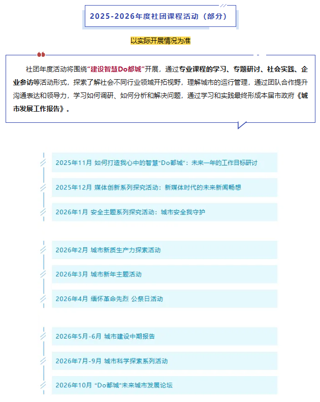 项目以社团形式进行全新优化,构建起城校沟通桥梁,为优秀的学生提供全新的校外教育与体验学习平台。“Do都城”第十一届市政府成员将围绕“联合国可持续发展目标”展开、PBL教育课程体系,定期参与专项成长课程,独立设计、组织活动,展现新时代少年风采。