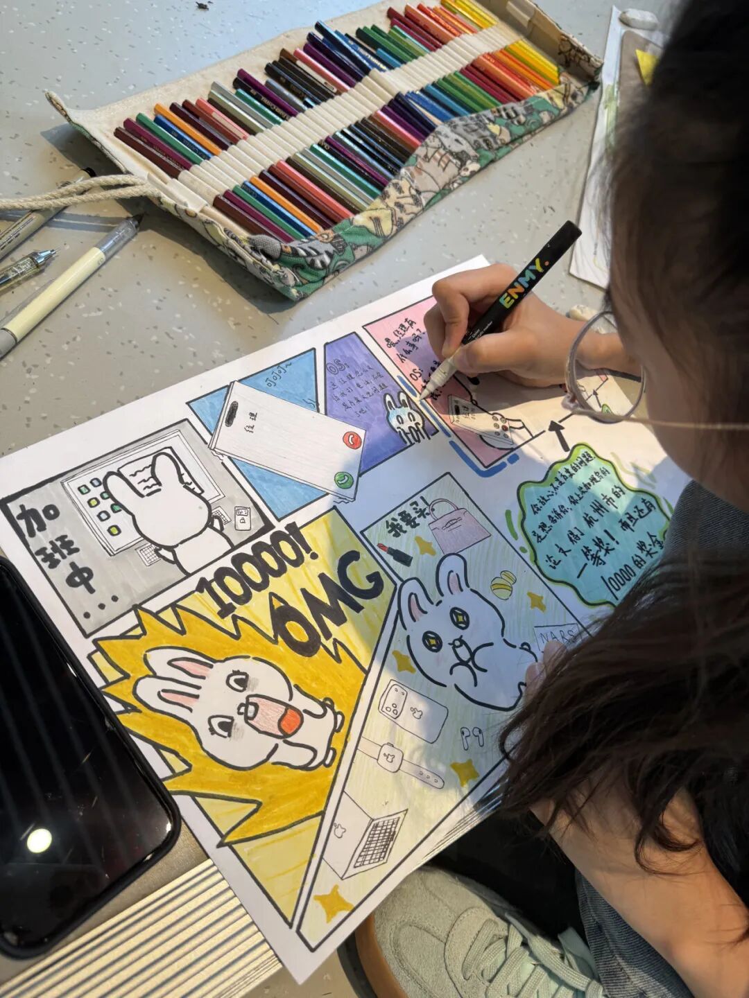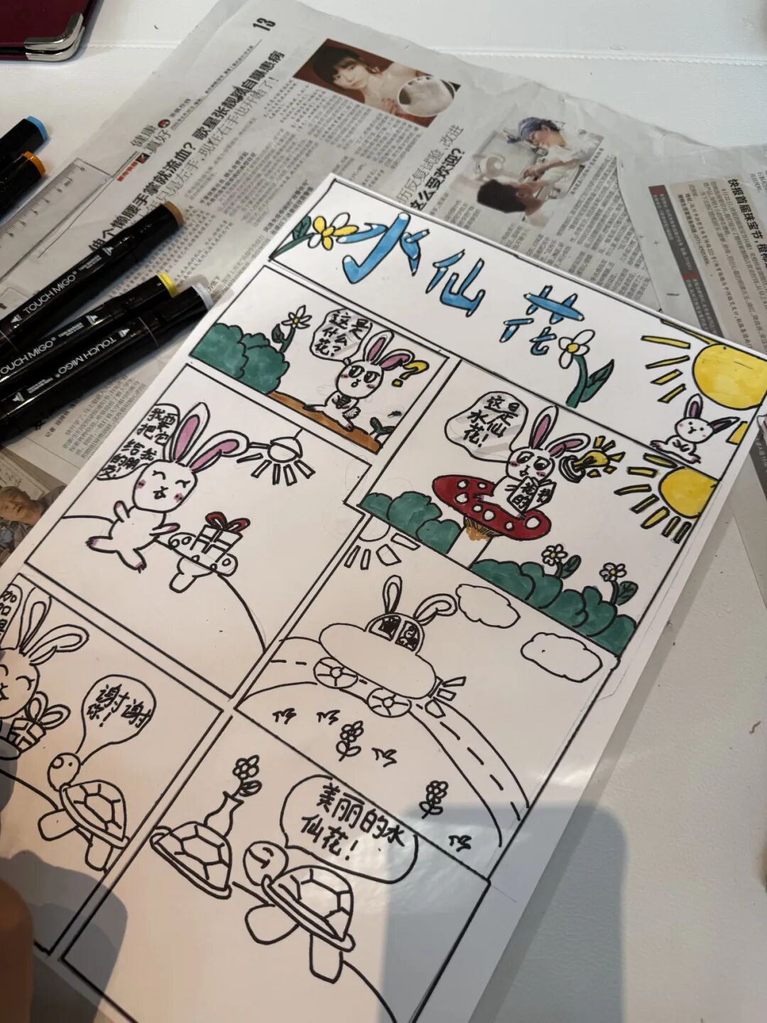 下午的考场,只听见画笔沙沙作响——最考验实力的四格漫画故事创编开始了!以华老的兔子为主题,孩子们需要构思一个完整的故事。