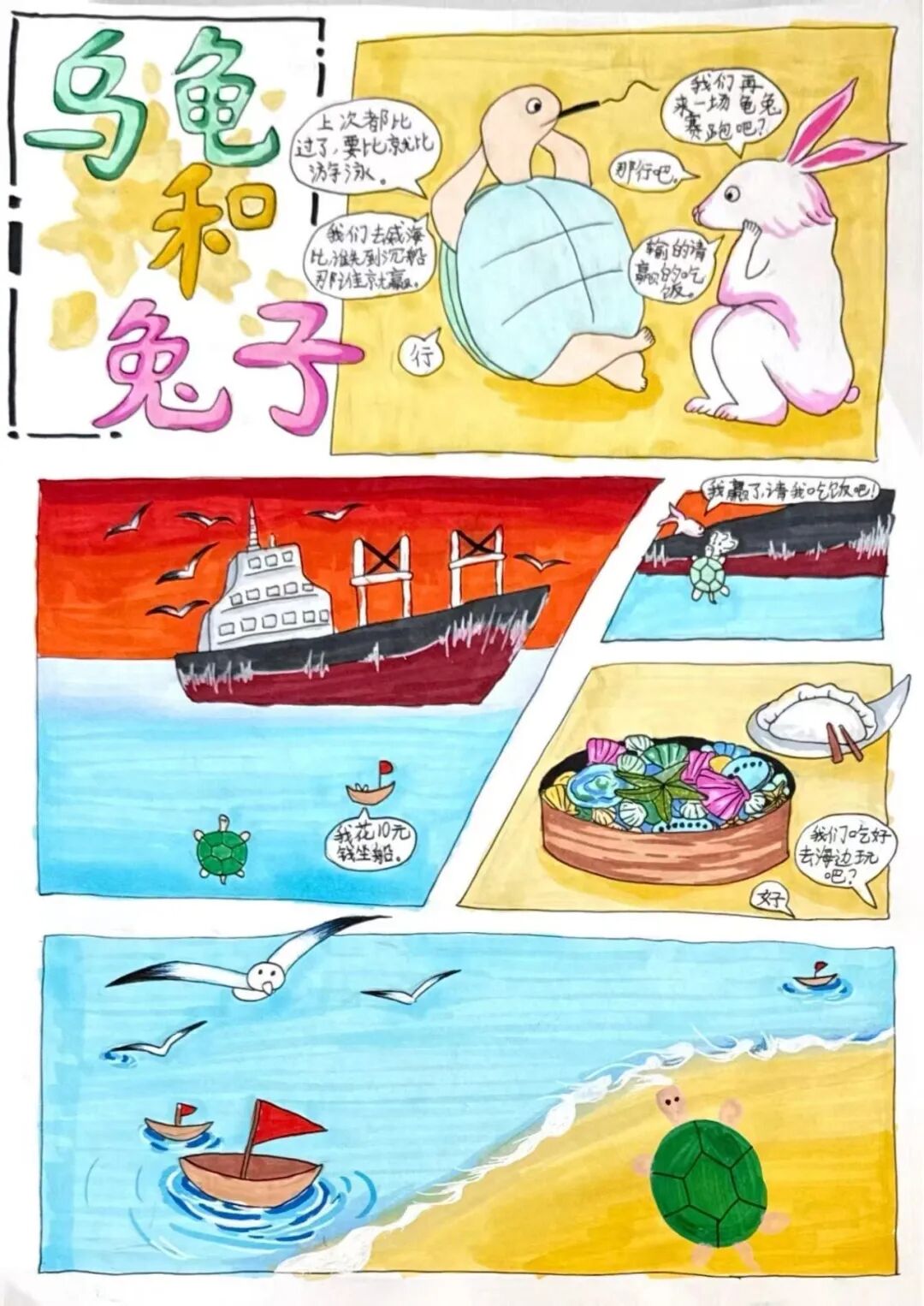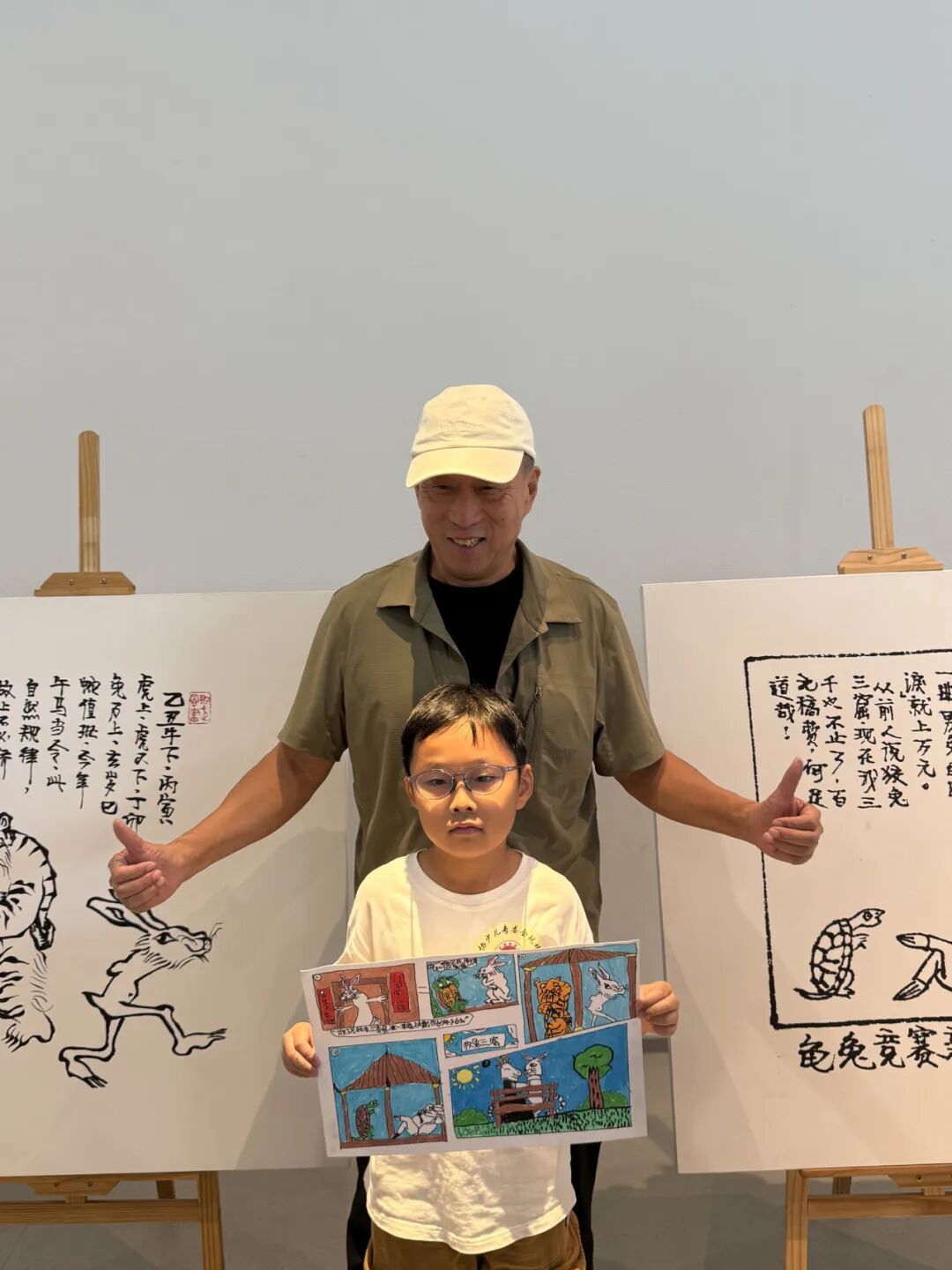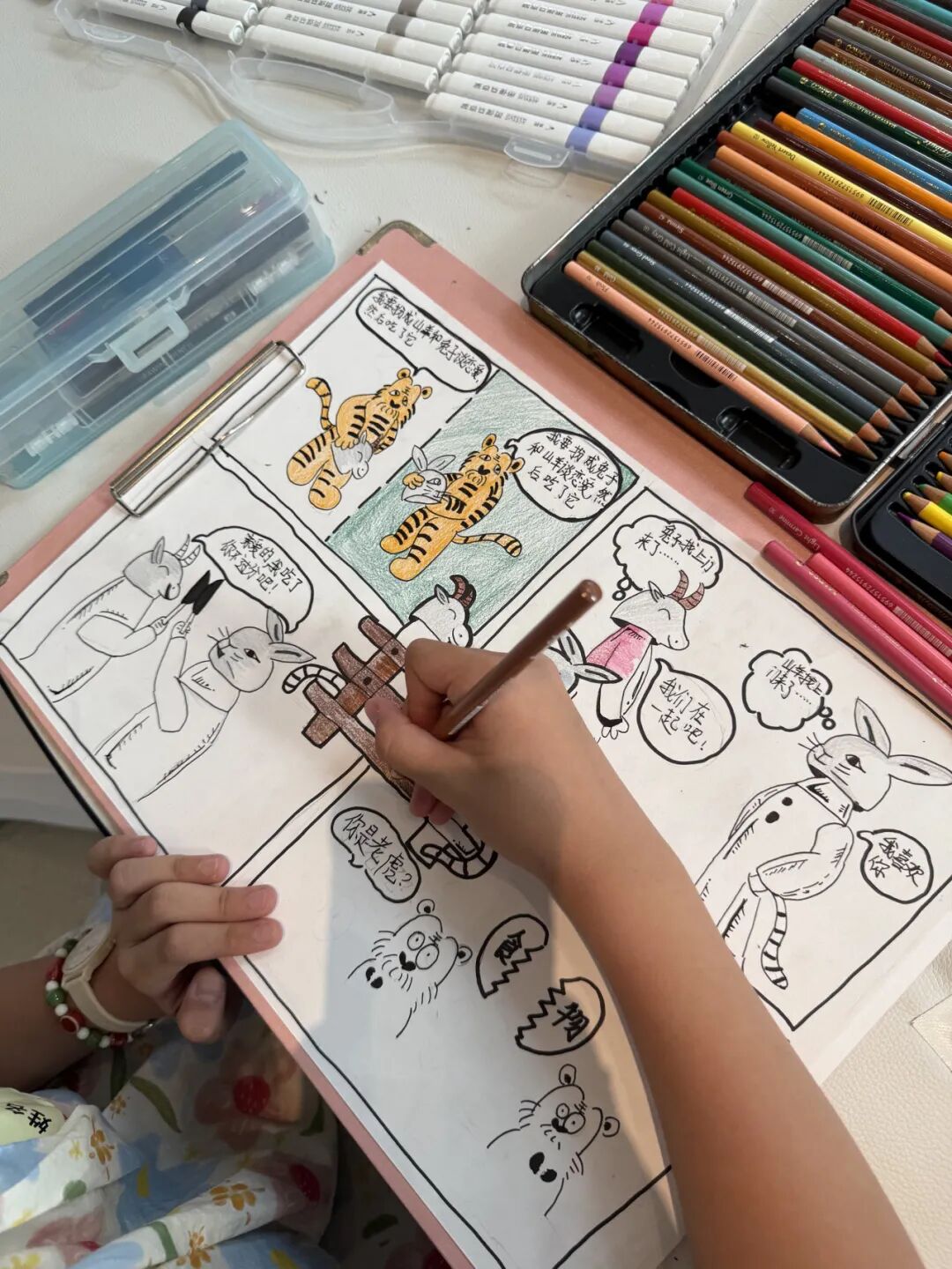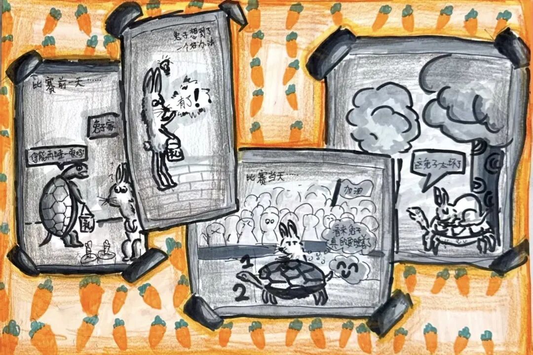 有的小画家抓耳挠腮,灵感忽隐忽现;有的则成竹在胸,下笔如有神。一个个奇思妙想的故事在画纸上诞生:有新编龟兔赛跑,有时尚的都市兔子,有穿越到古代的兔子......他们将上午的所见所闻、所感所想,都融入到了这小小的四格漫画中,用自己独特的视角和绘画风格,诠释对华老作品的理解和对漫画的热爱。