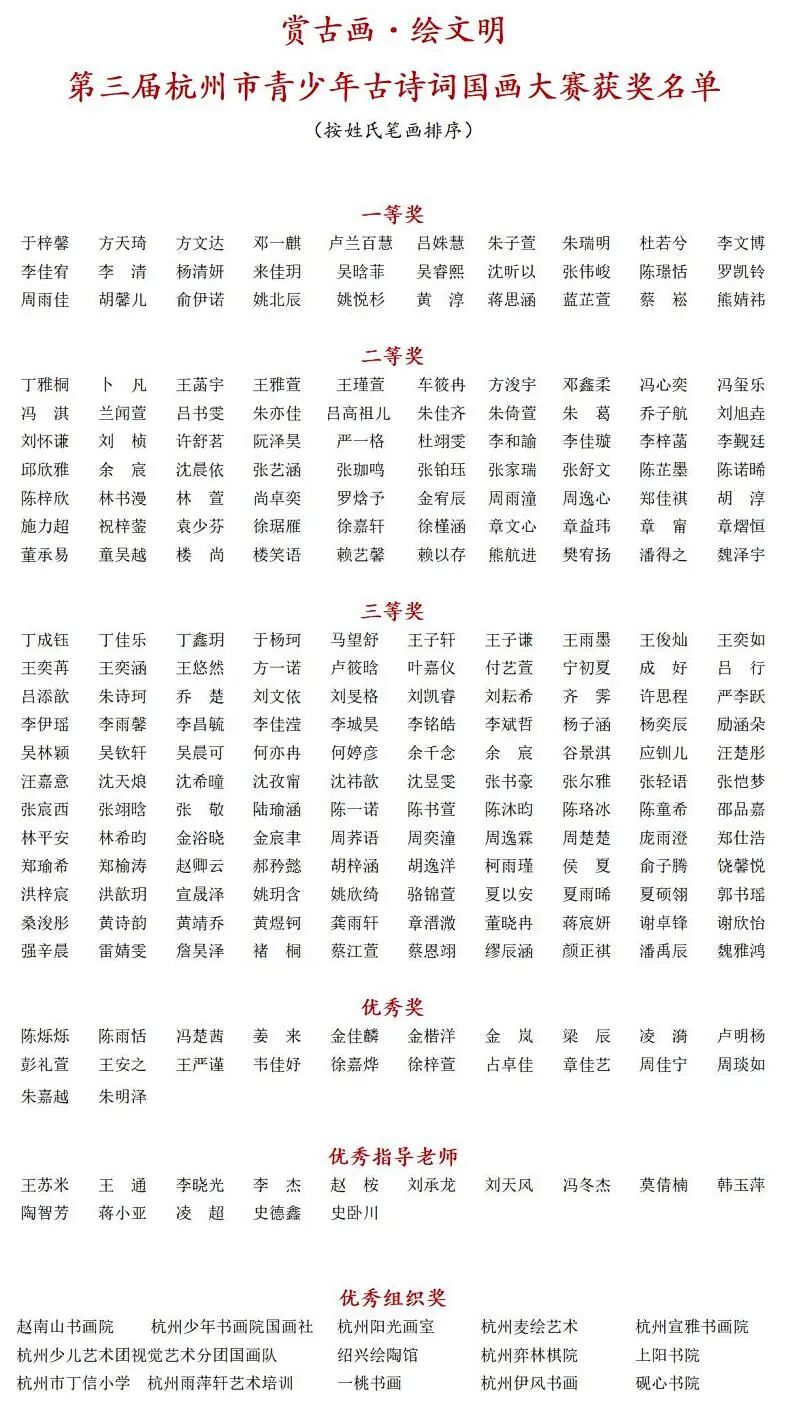 十月,丹桂飘香。“赏古画·绘文明”第三届杭州市青少年古诗词国画大赛终评工作结束,获奖名单正式揭晓。本次大赛以“以临古为径,在古诗词与国画的交融中探寻历史文化脉络”为核心,自征稿启动以来便得到全市青少年的热烈响应,两个月内收到有效投稿作品2000余件,最终经严格评审决出各类奖项。