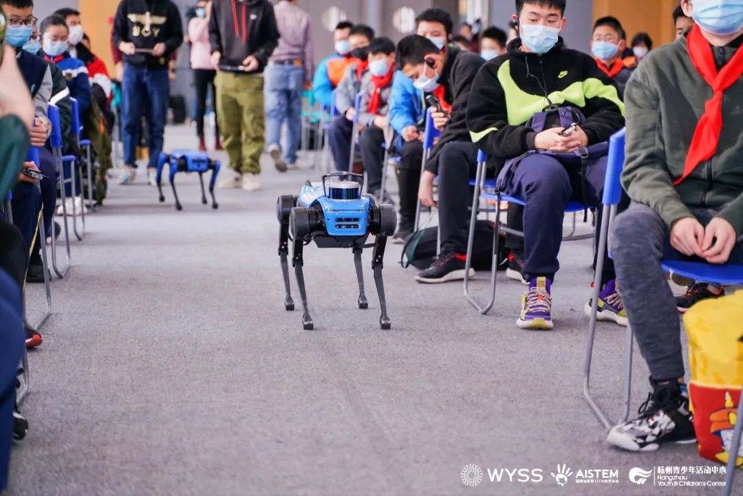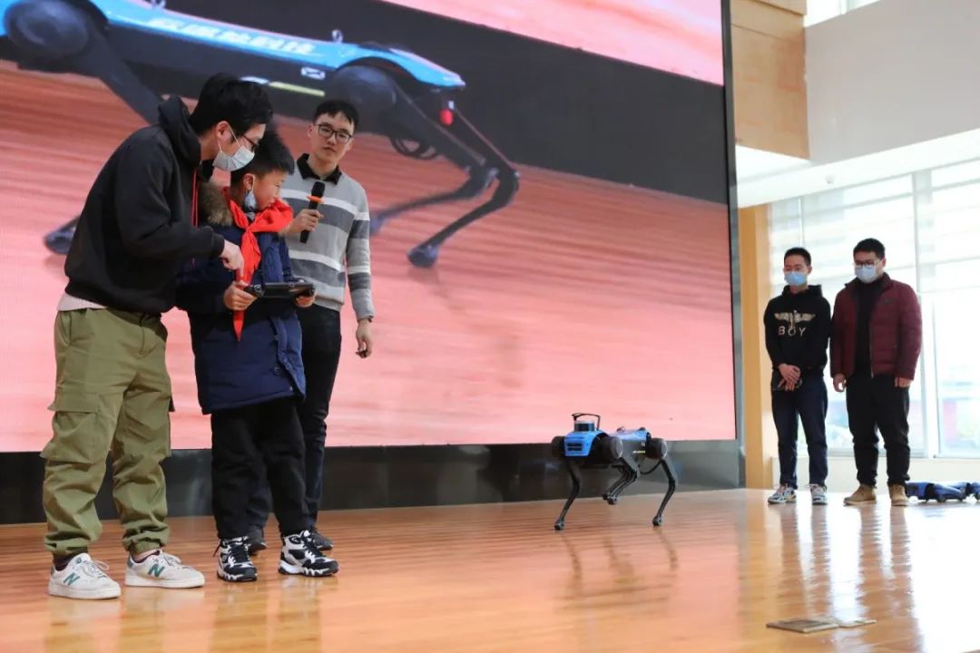 场的青少年展示了我国自主研发的智能四足机器人,他介绍到四足机器人的多方